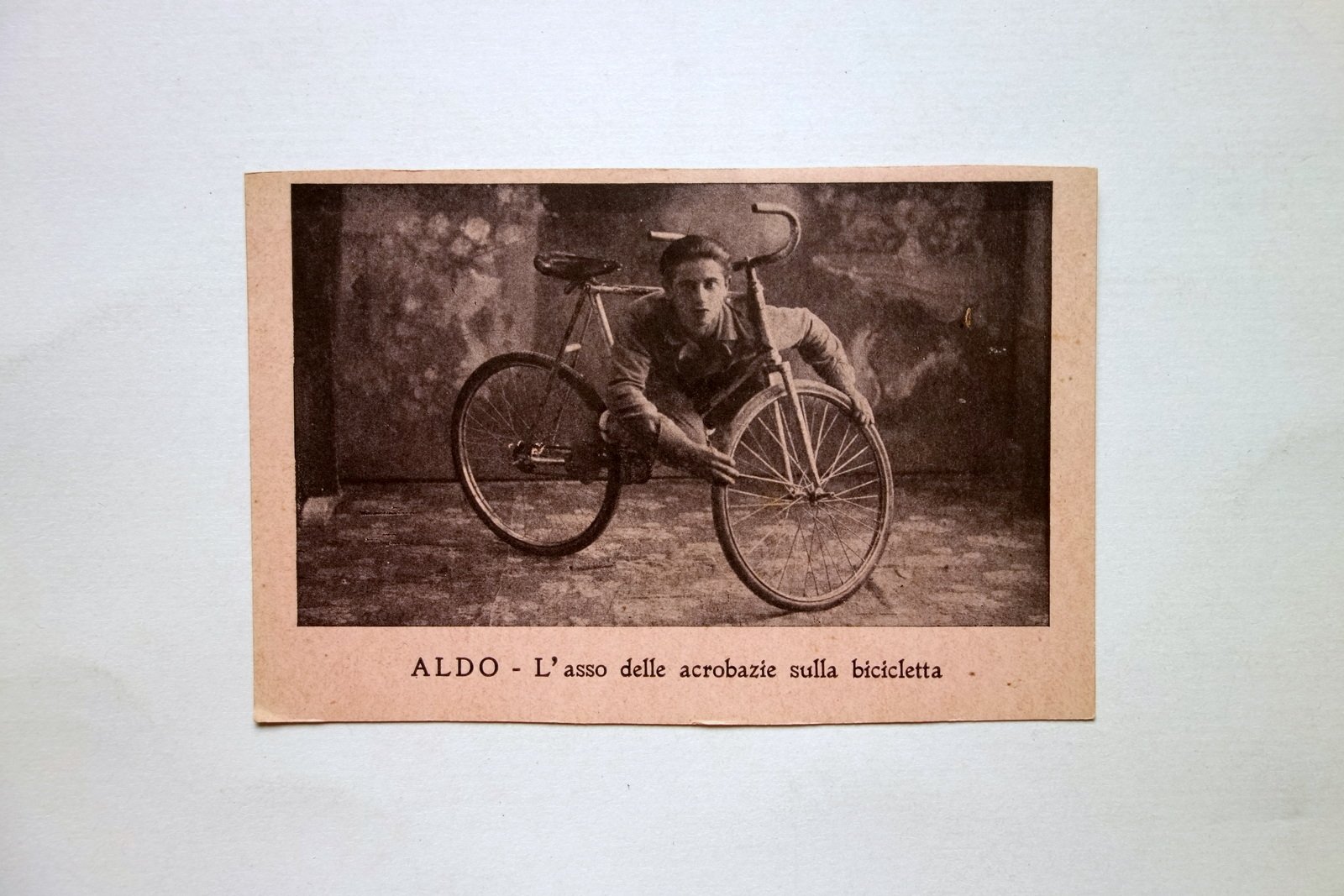 Cartoncino Aldo l'Asso delle Acrobazie sulla Bicicletta Primo '900 Raro