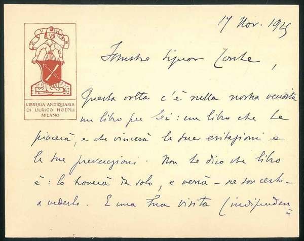 Cartoncino con logo della Libreria Hoepli datata 17 Novembre