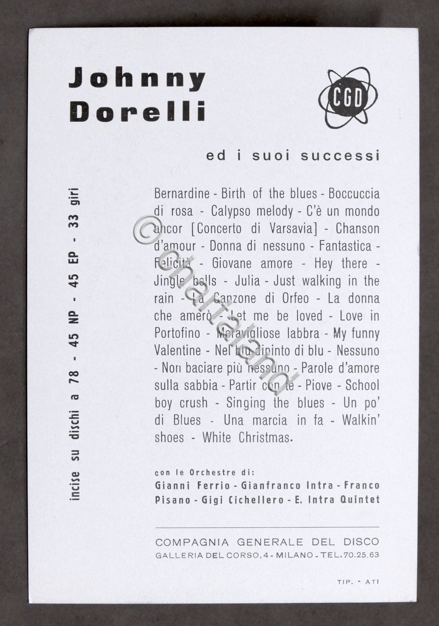 Cartoncino pubblicitario Dischi CGD - Johnny Dorelli - anni '60