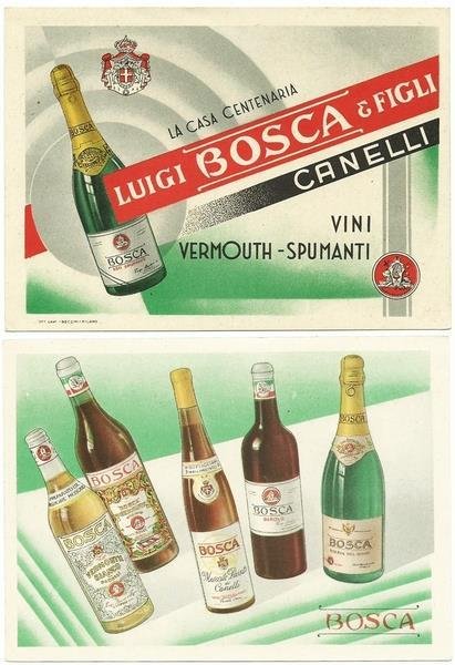 Bella illustrazione a colori ante - retro dei prodotti Bosca. Off. Graf. Necchi - Milano, s.d. ma anni '40. Cartoncino formato cartolina. 14,5x10,5. Stato di Nuovo. , Perfetto (Mint)