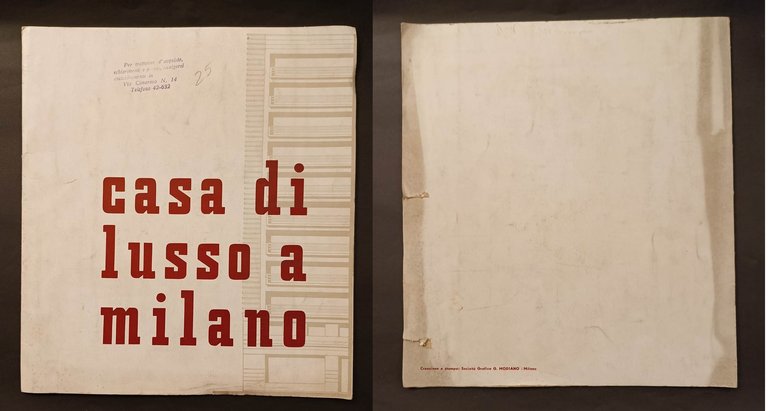 in 4 quadrato, bross. ed. con punti metallici pp. 10 e 1 pianta piu' volte ripiegata Ill. col. anche alle sguardie. Pubblicazione promozionale del progetto di palazzo di lusso affidato all'Ing. Giacomo Prearo e all'architetto G. Rancati in Piazza Fiume ora Piazza della Repubblica 6/8/10 a Milano. Timbri de lla società di servizi che si occupava della vendita (non identificata), note tecniche a matita, tagli ai margini che intessano sia la coperta che le ulktime pagine ed evidenti segni del tempo (bt)