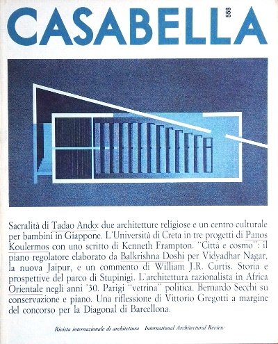 Casabella 558 - Sacralità di Tadao Ando: due architetture religiose e un centro culturale per bambini in Giappone. L'Università di Creta in tre progetti di Panos Koulermos con uno scritto di Kenneth Frampton. "Citt? e cosmo": il piano regolatore elaborato da Balkrishna Doshi per Vidyadhar Nagar, la nuova Jaipur, e un commento di William J.R. Curtis. Storia e prospettive del parco di Stupinigi. L'architettura razionalista in Africa Orientale negli anni '30. Parigi "vetrina" politica. Bernardo Secchi su conservazione e piano. Una riflessione di Vittorio Gregotti a margine del concorso per la Diagonal di Barcellona.
