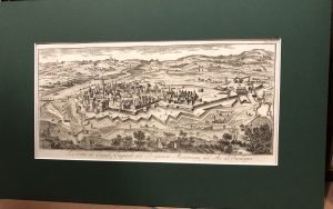 Bella veduta prospettica con la citta' fortificata al centro e parte della campagna circostante proveniente dall'opera del Salmon. Il foglio misura mm195x400 circa, prsenta le consuete pieghe maper il resto è in ottimo stato