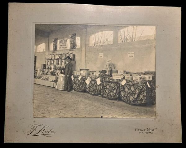32,7×25,7 cm; bella fotografia storica applicata su cartoncino scattata dal noto studio fotografico Rota di Casale Monferrato che aveva sede presso via Roma. La fotografia riproduce lesposizione della produzione della nota ditta agricola casalese dei Fratelli Ottavi, noti sopratutto per la loro produzione vinicola. Fotografia in ottime condizioni di conservazione.