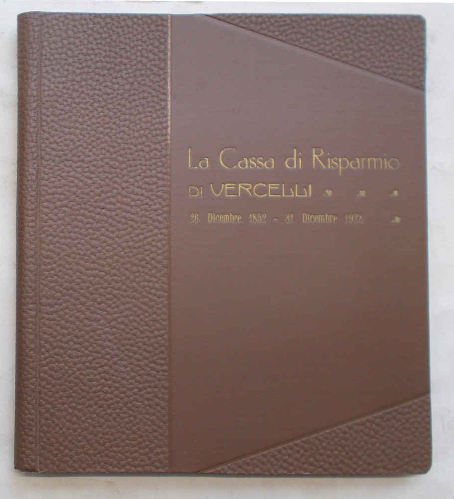 In 4° (cm. 29 x 25); pagg. (8) + 18 tavole in cartoncino goffrato con applicate altrettante fotografie originali , tutte di cm. 12 x 17,con cornicetta e didascalie a stampa. (Non ci sono indicazioni di chi sia stato il fotografo autore delle immagini); legatura in tela originale con titoli in oro e decori a secco; belle sguardie marmorizzate. VG+. ** Ottimo esemplare di questa pubblicazione celebrativa, realizzata in un numero molto limitato di esemplari e particolarmente pregiata perchè illustrata da vere fotografie. I soggetti sono la sede centrale di via San Cristoforo a Vercelli (2 esterni e 12 interni: uffici, sale, la porta blindata della "sala del tesoro", le cassette di sicurezza), 2 degli esterni delle filiali di Trino e Crescentino, oltre alle foto del libretto n. 1, emesso alla Società di Mutuo Soccorso degli Operai e della registrazione del primo deposito ricevuto.