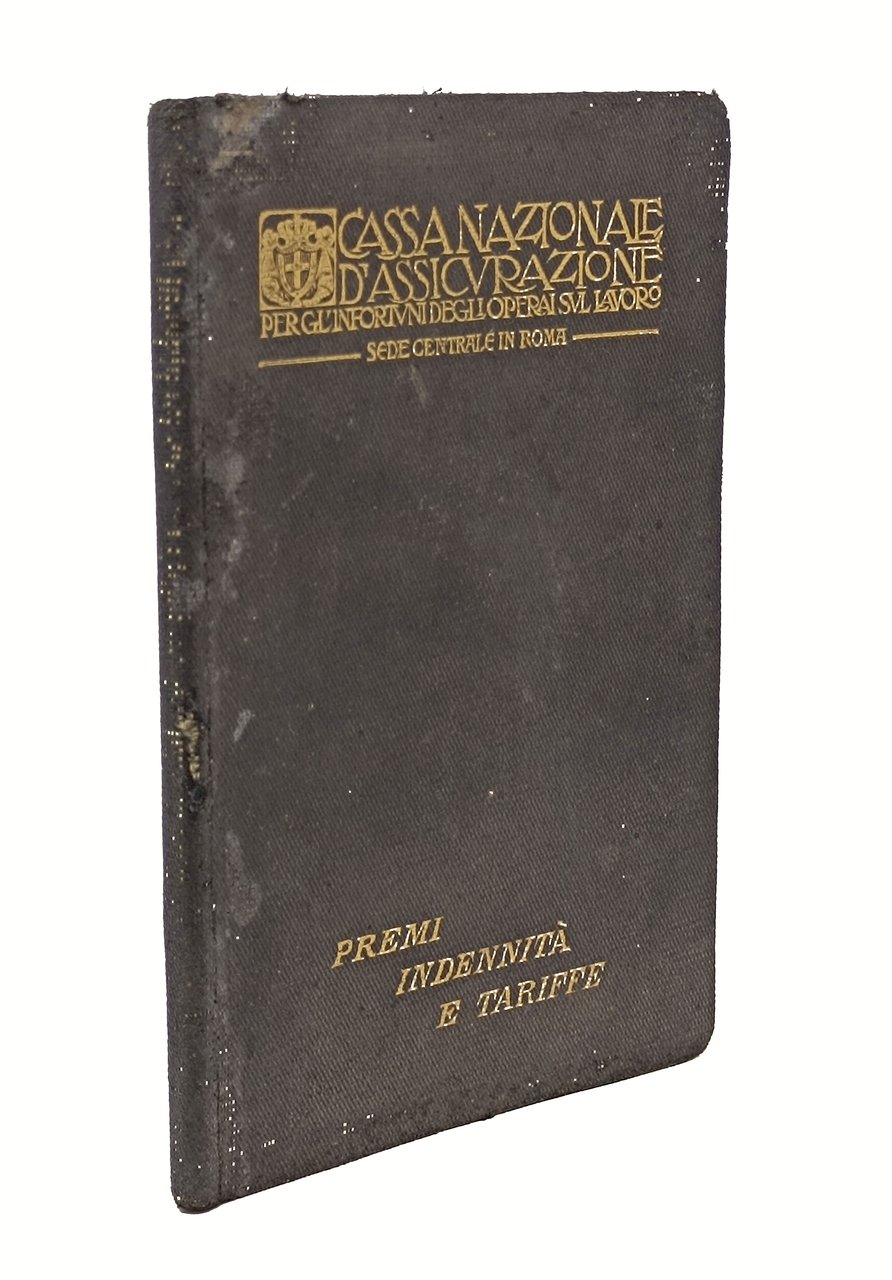 Formato: 9,5 x 15 cm circa. 204 pagine. Tantissime le tabelle che stabiliscono i premi e le tariffe a seconda dei vari tipi di lavoro. Curiosa la terza parte del libretto, dedicata all'assicurazione nella Tripolitania e Cirenaica. Particolarmente interessante la tariffa premi relativa alla navigazione con i premi per la 'Gente di mare' (suddiviso a seconda delle linee di navigazione). Stato conservativo: segni del tempo e dell'utilizzo, un po' di usure sulla tela che riveste la coperta, mancanza di una minuscola parte sull'angolo superiore dei fogli che vanno da pag. 55 a pag. 204. Nel complesso, un esemplare abbastanza buono. Privo di scritte o altri segni nel testo. raro