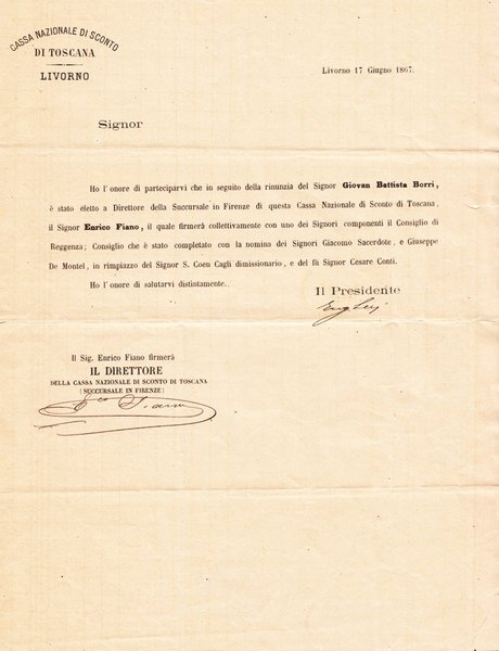 comunicazione firmata di Enrico Fiano di 1 facciata datata Livorno, 17 Giugno 1867 su carta intestata "Casa Nazionale di Sconto di Toscana. Livorno"; buon es.