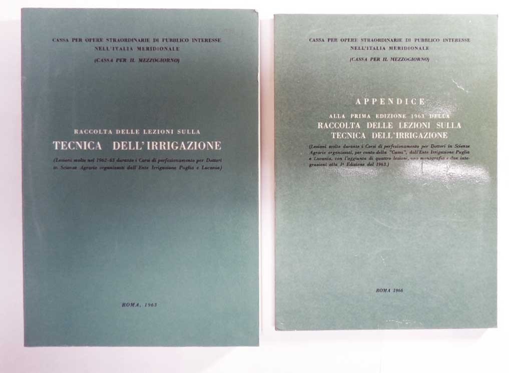Cassa per le opere straordinarie di pubblico interesse nell’Italia meridionale (Cassa per il Mezzogiorno), Raccolta delle lezioni sulla tecnica dell’irrigazione. Lezioni svolte nel 1962-63 durante i Corsi di perfezionamento per dottori in Scienze Agrarie organizzati dall’Ente Irrigazione Puglia e Lucania), s.n., Roma 1963, pp. 601, ill. b.n., 4 c. di tavv. ripiegate ill. b.n., cm 25, br. ed. Completo di: Id., Appendice alla prima edizione 1963 della Raccolta delle lezioni sulla tecnica dell’irrigazione. Lezioni svolte durante i Corsi di perfezionamento per dottori in Scienze Agrarie, per conto della Cassa, dall’Ente Irrigazione Puglia e Lucania, con l’aggiunta di quattro lezioni, una monografia e due integrazioni alla prima edizione del 1963, s.n., Roma 1963, pp. 174, ill. b.n., 1 c. di tav. ripiegata ill. b.n., cm 25, br. ed. Sommario: L. Cavazza, Rapporti tra acqua e terreno – E. Romano, Elementi di idrologia agraria applicata – T. Napoli, Variabili irrigue – N. Matarrese, Principi di sistemazione dei terreni di piano – G. Candura, Mezzi meccanici per la sistemazione dei terreni – M. Volpi, I sistemi e i metodi d’irrigazione – V. Carrante L’irrigazione delle piante erbacee ed arboree nel bacino del Mediterraneo – N. Ficco, Irrigazione con acque salmastre – T. Eschena, Adeguamento delle concimazioni minerali ed organiche in ambiente irriguo – D. Scardaccione, Orientamenti della produzione nelle terre di nuova irrigazione – D. Santovito, Approvvigionamento e derivazione a scopo irriguo dell’acqua da fiumi, laghi e grandi invasi artificiali – G. Crivellari, Moderni criteri nella costruzione dei laghetti collinari – L. Zorzi, Approvvigionamento di acque sotterranee a scopo irriguo – D. Santovito, Problemi di trasporto delle acque nelle reti irrigue anche in relazione agli attuali materiali a disposizione – A. Trimigliozzi, Misura dell’acqua e relativi manufatti di consegna – A. Trimigliozzi, Profili e sezioni di canali e condotte – G. Crivellari, Impianti di sollevamento – E. Romano, Irrigatori ad aspersione (prima parte) – G. Dipaola, Gli irrigatori ad aspersione (seconda parte) – N. Matarrese, Problemi di esercizio degli impianti irrigui aduso collettivo – N. Matarrese, Il grado di efficienza nella utilizzazione dell’acqua a scopi irrigui – N. Ficco, Progettazione di impianti irrigui aziendali – G. Cianci, Assistenza tecnica ed amministrativa agli agricoltori nei comprensori irrigui – D. Scardaccione, L’iirigazione e l’economia dei miglioramenti fondiari – A. Trimigliozzi, Legislazione sulle acque e sulle opere pubbliche. Sommario Appendice: N. Matarrese, Sistemi di esercizio degli impianti irrigui ad uso collettivo – N. Matarrese, Il piano generale di utilizzazione delle risorse idriche – A. Degan, Criteri di progettazione degli impianti irrigui con reti in pressione – B. Fagotti, Attuali problemi di conduzione delle aziende agrarie ed in particolare di quelle irrigue – F. Ravelli, Metodi ed apparecchi per la misura dell’umidità del terreno. Lotto composto di due volumi. Sigla d’appartenenza alla prima pagina di guardia dell’appendice. Perfetto. Raro.