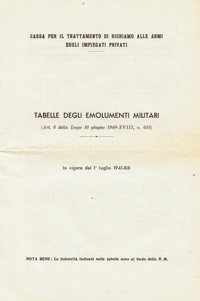 Cassa per il trattamento di richiamo alle armi degli impiegati privati. Tabelle degli emolumenti militari. In vigore dal 1 luglio 1941.