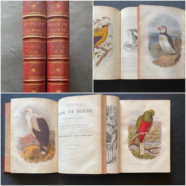 London, 1870 circa. Opera completa in quattro volumi in due tomi in 4to (Tomo I Vol. I e II - Tomo II Vol. III e IV). London and New York, Cassell, Petter, and Galpin. Primo tomo: volume I - pp. VIII (Contents and List of Illustration), 312 + 1 ultima tavola; volume II - pp. VIII (Contents and List of Illustration), 312 (con la Classification of Birds). Secondo tomo: volume III - pp. VIII (Contents and List of Illustration), 312 + 1 ultima tavola; volume IV - pp. VIII (Contents and List of Illustration), 320. In tutti i volumi sono presenti belle incisioni su acciaio in b/n n. t. e circa 40 bellissime tavole litografiche in colore f. t. Legature originali in mezza pelle con piatti in percallina verde, dorsi e punte in pelle rossa, titoli oro al dorso, contropiatti e fogli di guardia in carta decorata. Ex libris “Austin Gourlay of Kincraig”). Sporadiche fioriture, più diffuse alle pagine bianche e al retro delle tavole, salde ed eleganti legature, buono stato di conservazione. .