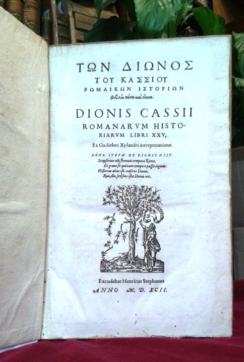 Due opere in un volume in folio legato in pelle, dorso a 5 nervi (spellature ai piatti), sguardie, frontespizio con grande marca silografica dello stampatore, 5 carte, 792 pp., 12 carte d'indici; frontespizio della seconda opera, stessa marca, 3 carte, 376 pp., bianca, 7 carte dello Spicilegium, 4 carte d'indici. Frontespizio bilingue greco latino, testo greco e traduzione latina sulla colonna a fianco. Splendido soprattutto l'alfabeto greco (detto 'du Roi') usato da Estienne, magnifica l'impaginazione, ottima la carta greve e bianca. L'opera abbraccia la storia romana fino al 230 circa, soffermandosi con ampiezza e completezza sul periodo ultimo citato, di cui testimone ed attore, essendo stato Senatore sotto Commodo per addivenire Governatore di Smirne dopo la morte di Settimio Severo, Proconsole in Africa e Pannonia e Console per la seconda volta assieme ad Alessandro Severo che lo apprezzava grandemente. Ritiratosi a vita privata, mor nella nativa Bitinia. L'importanza dell'opera dionea eccezionale per l'immediatezza della relazione e per l'accuratezza storica. Il volume che si presenta in pi che bello stato, lamentando solo alcune sporadiche tracce tarlacee nel margine inferiore di alcune carte della seconda opera che sfiorano a malapena una o due lettere dell'ultima riga di testo in una ventina di carte. Davvero eccellente e di grandissimo interesse oltrech di buona rarit.