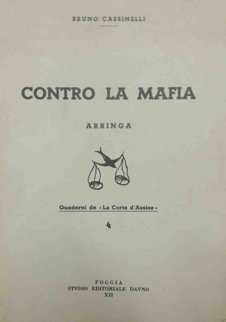 Bruno Cassinelli, Contro la mafia. Arringa per la parte civile Cullò. (Corte d’Assise di Catanzaro: 8 marzo 1933), con notizia di Giuseppe Casalinuovo, Studio Editoriale Dauno, Foggia s.d. (1934?), pp. 24, 1 c. di tav. f.t. ill. b.n. con ritratto dell’autore, cm 24, opuscolo spillato. Collana Quaderni de La Corte d’Assise, n. 4. Minima brunitura della carta, per il resto ben conservato.