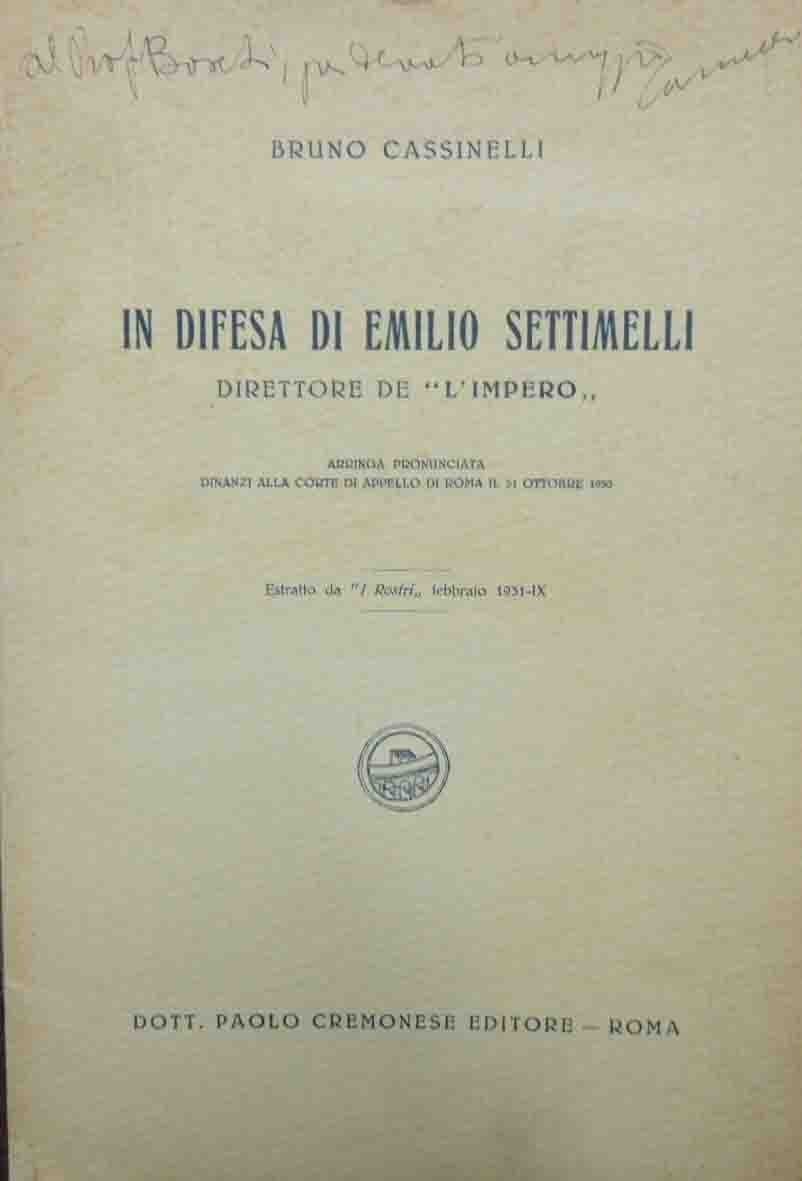 Bruno Cassinelli, In difesa di Emilio Settimelli direttore de L’Impero. Arringa pronunciata dinanzi alla Corte di Appello di Roma il 31 ottobre 1930, Dott. Paolo Cremonese Editore, Roma s.d. (1931?), pp. 22, 1 c. di tav. f.t. ill. b.n. con ritratto fotografico dell’autore, cm 24, pubblicazione spillata. Estratto da I Rostri, febbraio 1931. Alla prima di copertina, dedica autografa dell’autore. Leggere tracce d’uso, carta uniformemente brunita, per il resto ben conservato.
