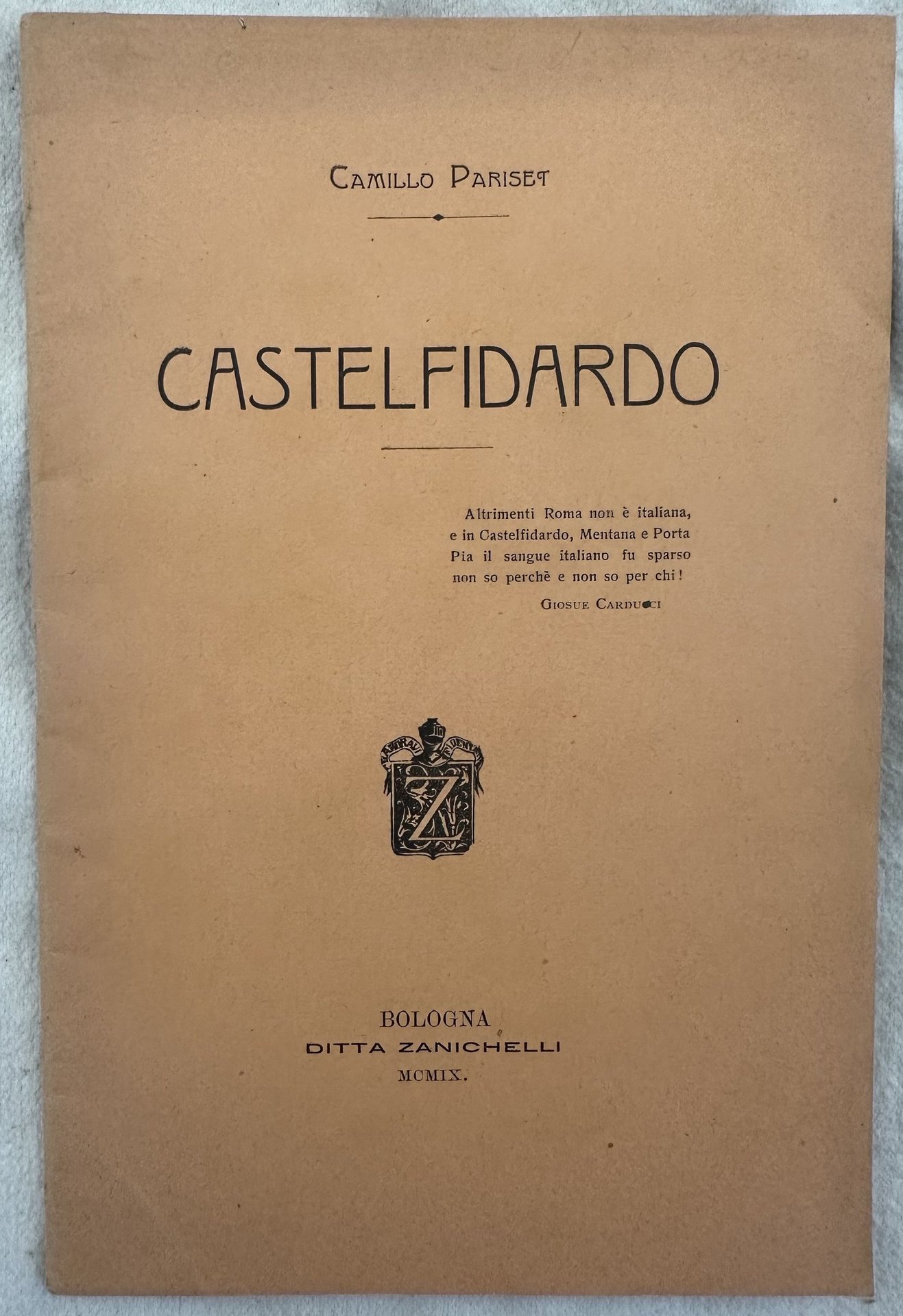 Rara pubblicazione del 1909 su Castelfidardo scritto da Camillo Pariset. Commemorazione tenuta dinnanzi all'iossario dei caduti il 18 settembre 1909. In ottime condizioni. Copertina editoriale in buone condizioni generali con lievi usure ai margini e dorso. Legatura in buone condizioni. All'interno le pagine si presentano in ottime condizioni con rare fioriture. Da rifilare. In 8. cm 21x14. pp. 27+(5).Interesting pamphlet of 1909 about Castelfidardo written by Camillo Pariset. Memory held in front of the bones of dead people the 18th of september 1909. In very good conditions. Editorial cover in good conditions lightly worn in the extremities. Binding in good conditions. Pages in very good conditions with occasional foxing. Stil uncut. In 8. cm 21x14. pp. 27+(5).