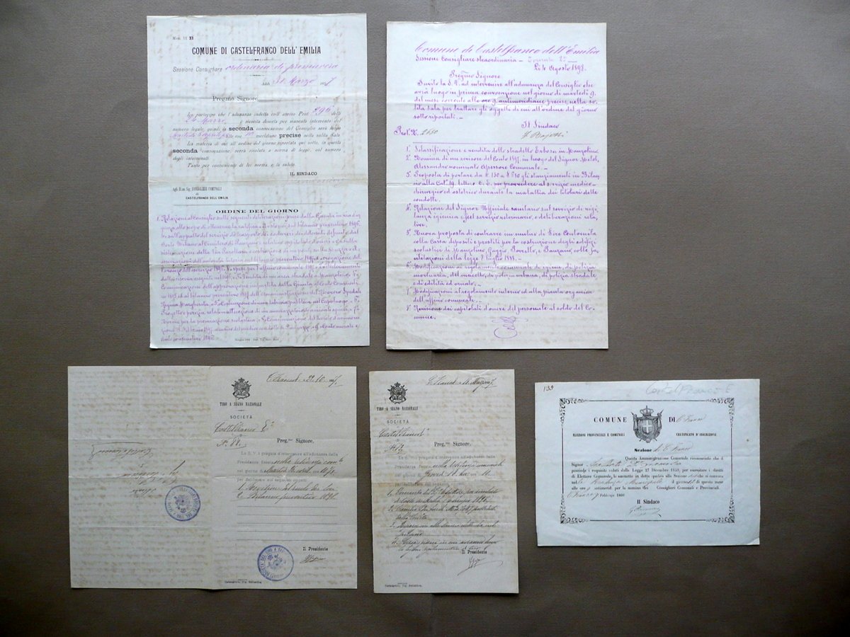 Carteggio, Castelfranco Emilia (Provincia di Modena) Carteggio a stampa con compilazione e annotazioni manoscritte Relativo alle elezioni comunali e ad alcune riunioni della locale Società del Tiro a Segno Nazionale 1896 - 1898 1896 - 1898; carteggio costituito da cinque documenti a stampa su carta (fogli e bifoli), due dei quali con intestazione della locale Società del Tiro a Segno Nazionale (vedi foto); sezioni bianche con compilazione manoscritta; retro di vari fogli con annotazioni d'epoca a penna (vedi foto). Documenti della Società del Tiro a Segno entrambi con timbro della suddetta (vedi foto). Cm 31,5x21 (documenti di maggiori dimensioni); cm circa 21x15 (documenti di minori dimensioni). Condizioni di conservazione Documenti tutti complessivamente ben conservati con tracce d'uso e pieghe di conservazione; un foglio con alcuni strappetti in corrispondenza della piega centrale, restaurati mediante l'applicazione di nastro adesivo. SC03.D11699 N
