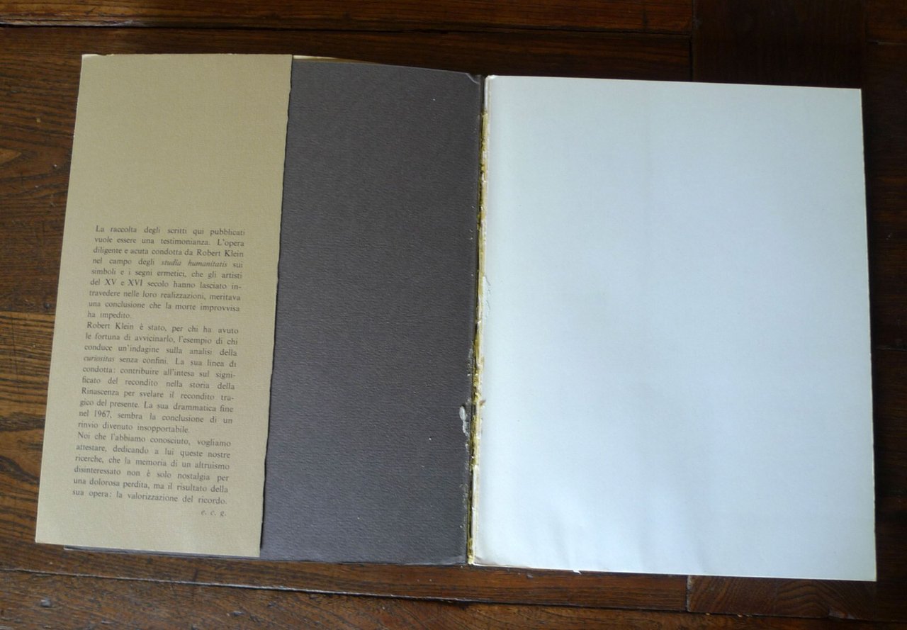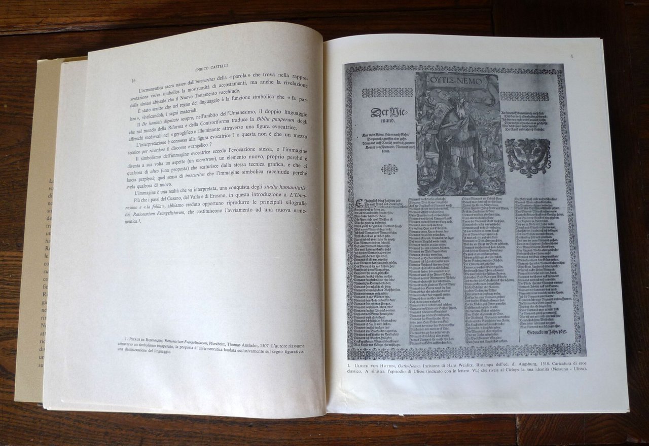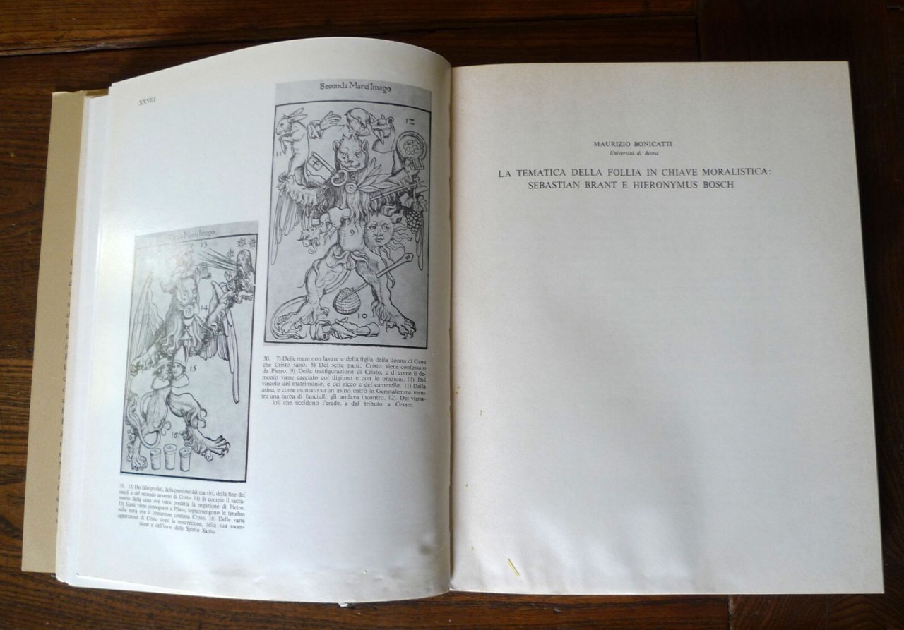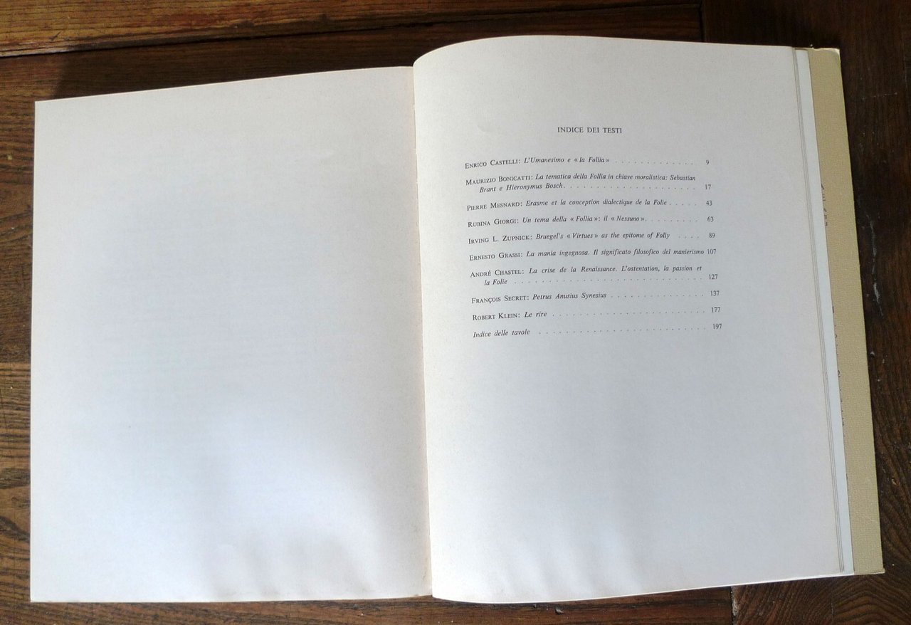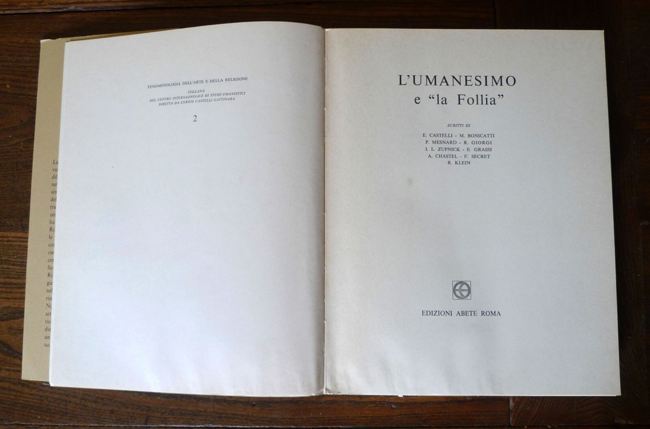 L'UMANESIMO E "LA FOLLIA".Scritti di E. Castelli - M.Bonicatti -P.Mesnard - R. Giorgi - I.L.Zupnick -E.Grassi - A.Chastel - F.Secret - R.Klein.Edizioni Abete, Roma 1971,brossura con sovraccoperta, 27,5x22 cm., pp.201+LXI tavv.,illustrazioni in nero su tavole fuori testo,FENOMENOLOGIA DELL'ARTE E DELLA RELIGIONE / 2,collana del Centro Internazionale di Studi Umanisticidiretta da Enrico Castelli Gattinara,testi in italiano, francese, inglese, latino,peso: kg.1,2cod.9377CONDIZIONI DEL LIBRO: accettabili,macchia alla copertina,firma e data all'occhiello,tracce di umidità nella parte bassa delle pagine: le pagine sono leggermnte raggrinzite,le pagine in carta patinata contenenti le tavolesi erano "incollate", presentano abrasioni nel margine basso,nonostante i difetti il libro può essere completamenteletto/consultato