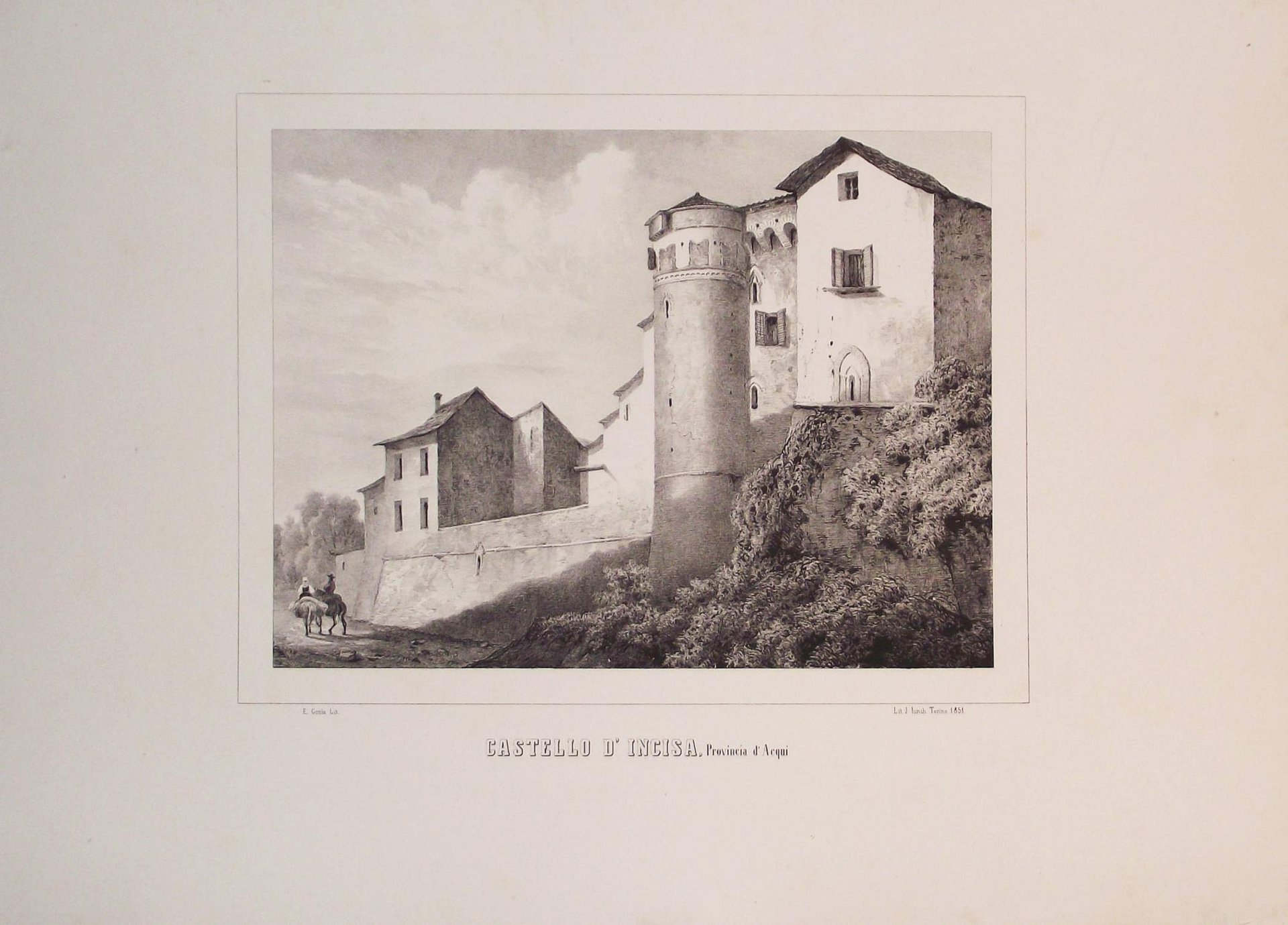 >Litografia originale circa 410x570 mm, firmata da Enrico Gonin quale autore del disegno e da J. Junck, Fr.lli Doyen o D.Festa quali litografi. Bella veduta animata da personaggi in primo piano, è l'unica incisione di Incisa realizzata prima della metà dell'800. Impressi nel margine inferiore sono il titolo e l'indicazione della famiglia nobile proprietaria. Bell'esemplare a pieni margini tratto dall'Album delle principali Castella Feudali della Monarchia di Savoia. Torino, Fontana, 1841-57, contenente 200 tavole litografiche disegnate e litografate da Enrico Gonin impresse a Torino da D. Festa, Junck e Doyen, celebre serie di vedute dei castelli e ville del Piemonte e Valle d'Aosta Enrico Gonin (Torino, 1798-1856), fratello del più noto pittore Francesco; discepolo di Pietro Giovanni Palmieri, ereditò da questi l'arte litografica, e lavorò profusamente per gli editori Marietti, Doyen e Fontana. Queste vedute, espressione di un tardo romanticismo pittorico, oltre ai loro pregi artistici e alla loro importanza per la storia dell'arte litografica in Piemonte, costituiscono un documento di eccezionale valore per lo studio del patrimonio monumentale del Piemonte.Buon esemplare a pieni margini.
