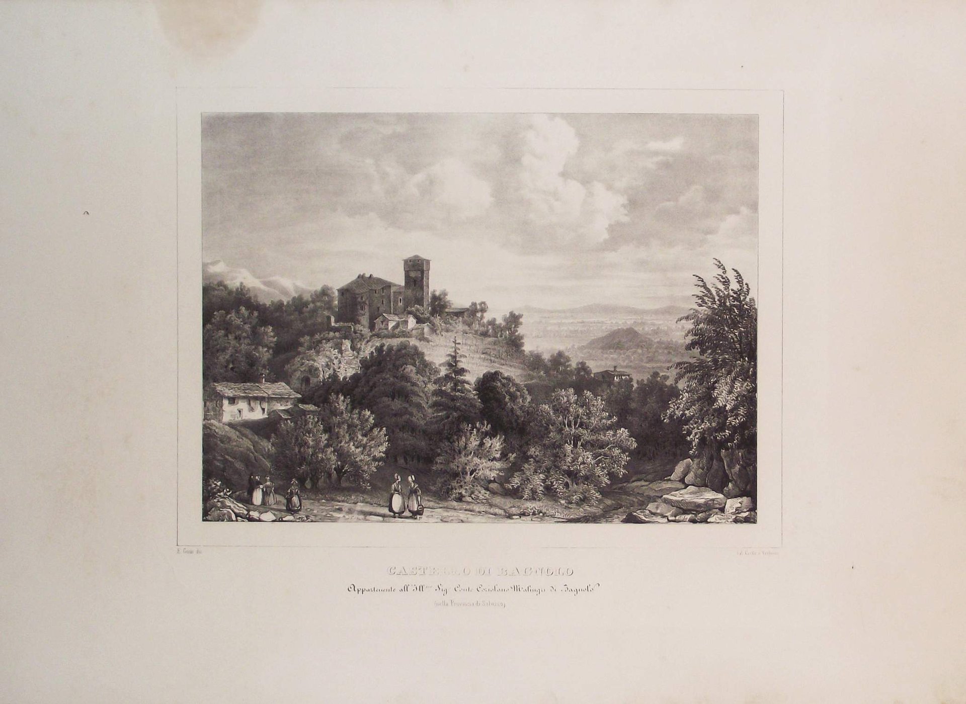 >Litografia originale circa 410x570 mm, firmata da Enrico Gonin quale autore del disegno e da J. Junck, Fr.lli Doyen o D.Festa quali litografi. Bella veduta animata da personaggi in primo piano, è l'unica incisione di Bagnolo realizzata prima della metà dell'800. Impressi nel margine inferiore sono il titolo e l'indicazione della famiglia nobile proprietaria. Bell'esemplare a pieni margini tratto dall'Album delle principali Castella Feudali della Monarchia di Savoia. Torino, Fontana, 1841-57, contenente 200 tavole litografiche disegnate e litografate da Enrico Gonin impresse a Torino da D. Festa, Junck e Doyen, celebre serie di vedute dei castelli e ville del Piemonte e Valle d'Aosta Enrico Gonin (Torino, 1798-1856), fratello del più noto pittore Francesco; discepolo di Pietro Giovanni Palmieri, ereditò da questi l'arte litografica, e lavorò profusamente per gli editori Marietti, Doyen e Fontana. Queste vedute, espressione di un tardo romanticismo pittorico, oltre ai loro pregi artistici e alla loro importanza per la storia dell'arte litografica in Piemonte, costituiscono un documento di eccezionale valore per lo studio del patrimonio monumentale del Piemonte.Buon esemplare a pieni margini.