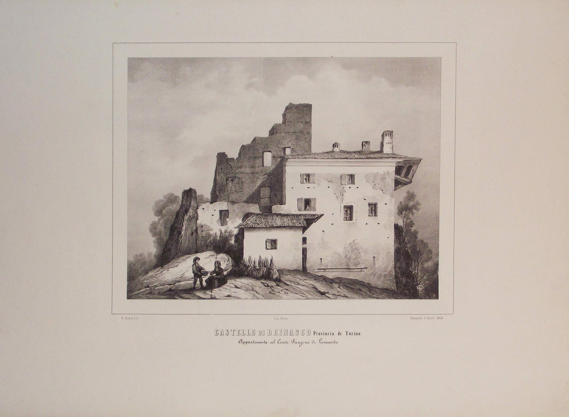 >Litografia originale circa 410x565 mm, firmata da Enrico Gonin quale autore del disegno e da J. Junck, Fr.lli Doyen o D.Festa quali litografi. Bella veduta animata da personaggi in primo piano, è l'unica incisione di Beinasco realizzata prima della metà dell'800. Impressi nel margine inferiore sono il titolo e l'indicazione della famiglia nobile proprietaria. Bell'esemplare a pieni margini tratto dall'Album delle principali Castella Feudali della Monarchia di Savoia. Torino, Fontana, 1841-57, contenente 200 tavole litografiche disegnate e litografate da Enrico Gonin impresse a Torino da D. Festa, Junck e Doyen, celebre serie di vedute dei castelli e ville del Piemonte e Valle d'Aosta Enrico Gonin (Torino, 1798-1856), fratello del più noto pittore Francesco; discepolo di Pietro Giovanni Palmieri, ereditò da questi l'arte litografica, e lavorò profusamente per gli editori Marietti, Doyen e Fontana. Queste vedute, espressione di un tardo romanticismo pittorico, oltre ai loro pregi artistici e alla loro importanza per la storia dell'arte litografica in Piemonte, costituiscono un documento di eccezionale valore per lo studio del patrimonio monumentale del Piemonte.Buon esemplare a pieni margini.