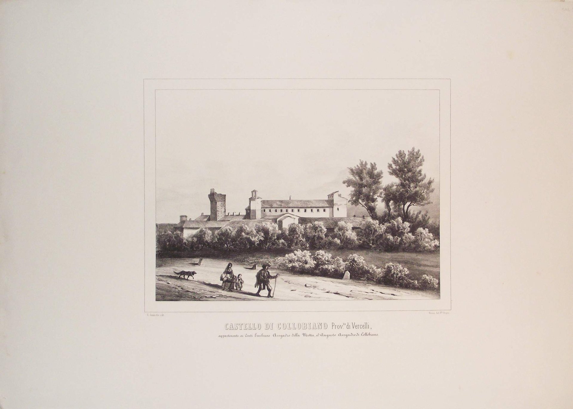 >Litografia originale circa 460x650 mm, firmata da Enrico Gonin quale autore del disegno e da J. Junck, Fr.lli Doyen o D.Festa quali litografi. Bella veduta animata da personaggi in primo piano, è l'unica incisione di Collobiano realizzata prima della metà dell'800. Impressi nel margine inferiore sono il titolo e l'indicazione della famiglia nobile proprietaria. Bell'esemplare a pieni margini tratto dall'Album delle principali Castella Feudali della Monarchia di Savoia. Torino, Fontana, 1841-57, contenente 200 tavole litografiche disegnate e litografate da Enrico Gonin impresse a Torino da D. Festa, Junck e Doyen, celebre serie di vedute dei castelli e ville del Piemonte e Valle d'Aosta Enrico Gonin (Torino, 1798-1856), fratello del più noto pittore Francesco; discepolo di Pietro Giovanni Palmieri, ereditò da questi l'arte litografica, e lavorò profusamente per gli editori Marietti, Doyen e Fontana. Queste vedute, espressione di un tardo romanticismo pittorico, oltre ai loro pregi artistici e alla loro importanza per la storia dell'arte litografica in Piemonte, costituiscono un documento di eccezionale valore per lo studio del patrimonio monumentale del Piemonte.Buon esemplare a pieni margini.