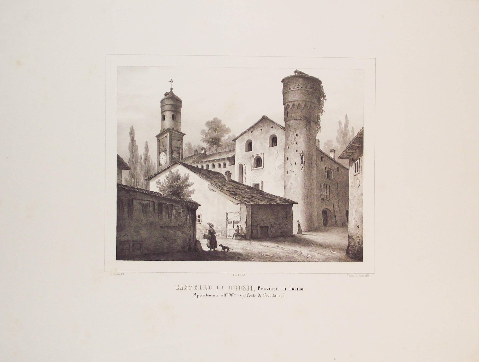 >Litografia originale circa 415x570 mm, firmata da Enrico Gonin quale autore del disegno e da J. Junck, Fr.lli Doyen o D.Festa quali litografi. Bella veduta animata da personaggi in primo piano, è l'unica incisione di Drosio realizzata prima della metà dell'800. Impressi nel margine inferiore sono il titolo e l'indicazione della famiglia nobile proprietaria. Bell'esemplare a pieni margini tratto dall'Album delle principali Castella Feudali della Monarchia di Savoia. Torino, Fontana, 1841-57, contenente 200 tavole litografiche disegnate e litografate da Enrico Gonin impresse a Torino da D. Festa, Junck e Doyen, celebre serie di vedute dei castelli e ville del Piemonte e Valle d'Aosta Enrico Gonin (Torino, 1798-1856), fratello del più noto pittore Francesco; discepolo di Pietro Giovanni Palmieri, ereditò da questi l'arte litografica, e lavorò profusamente per gli editori Marietti, Doyen e Fontana. Queste vedute, espressione di un tardo romanticismo pittorico, oltre ai loro pregi artistici e alla loro importanza per la storia dell'arte litografica in Piemonte, costituiscono un documento di eccezionale valore per lo studio del patrimonio monumentale del Piemonte.Buon esemplare a pieni margini.