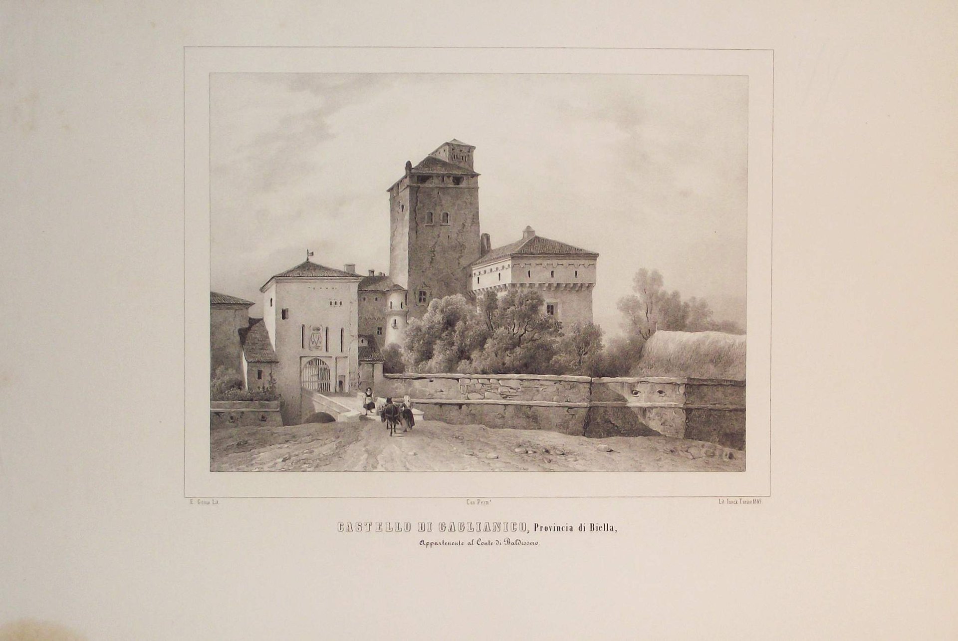 >Litografia originale circa 410x575 mm, firmata da Enrico Gonin quale autore del disegno e da J. Junck, Fr.lli Doyen o D.Festa quali litografi. Bella veduta animata da personaggi in primo piano, è l'unica incisione di Gaglianico realizzata prima della metà dell'800. Impressi nel margine inferiore sono il titolo e l'indicazione della famiglia nobile proprietaria. Bell'esemplare a pieni margini tratto dall'Album delle principali Castella Feudali della Monarchia di Savoia. Torino, Fontana, 1841-57, contenente 200 tavole litografiche disegnate e litografate da Enrico Gonin impresse a Torino da D. Festa, Junck e Doyen, celebre serie di vedute dei castelli e ville del Piemonte e Valle d'Aosta Enrico Gonin (Torino, 1798-1856), fratello del più noto pittore Francesco; discepolo di Pietro Giovanni Palmieri, ereditò da questi l'arte litografica, e lavorò profusamente per gli editori Marietti, Doyen e Fontana. Queste vedute, espressione di un tardo romanticismo pittorico, oltre ai loro pregi artistici e alla loro importanza per la storia dell'arte litografica in Piemonte, costituiscono un documento di eccezionale valore per lo studio del patrimonio monumentale del Piemonte.Buon esemplare a pieni margini.