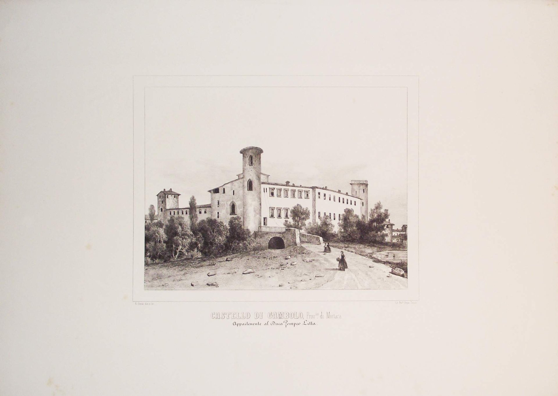 >Litografia originale circa 460x650 mm, firmata da Enrico Gonin quale autore del disegno e da J. Junck, Fr.lli Doyen o D.Festa quali litografi. Bella veduta animata da personaggi in primo piano, è l'unica incisione di Gambolò realizzata prima della metà dell'800. Impressi nel margine inferiore sono il titolo e l'indicazione della famiglia nobile proprietaria. Bell'esemplare a pieni margini tratto dall'Album delle principali Castella Feudali della Monarchia di Savoia. Torino, Fontana, 1841-57, contenente 200 tavole litografiche disegnate e litografate da Enrico Gonin impresse a Torino da D. Festa, Junck e Doyen, celebre serie di vedute dei castelli e ville del Piemonte e Valle d'Aosta Enrico Gonin (Torino, 1798-1856), fratello del più noto pittore Francesco; discepolo di Pietro Giovanni Palmieri, ereditò da questi l'arte litografica, e lavorò profusamente per gli editori Marietti, Doyen e Fontana. Queste vedute, espressione di un tardo romanticismo pittorico, oltre ai loro pregi artistici e alla loro importanza per la storia dell'arte litografica in Piemonte, costituiscono un documento di eccezionale valore per lo studio del patrimonio monumentale del Piemonte.Buon esemplare a pieni margini.