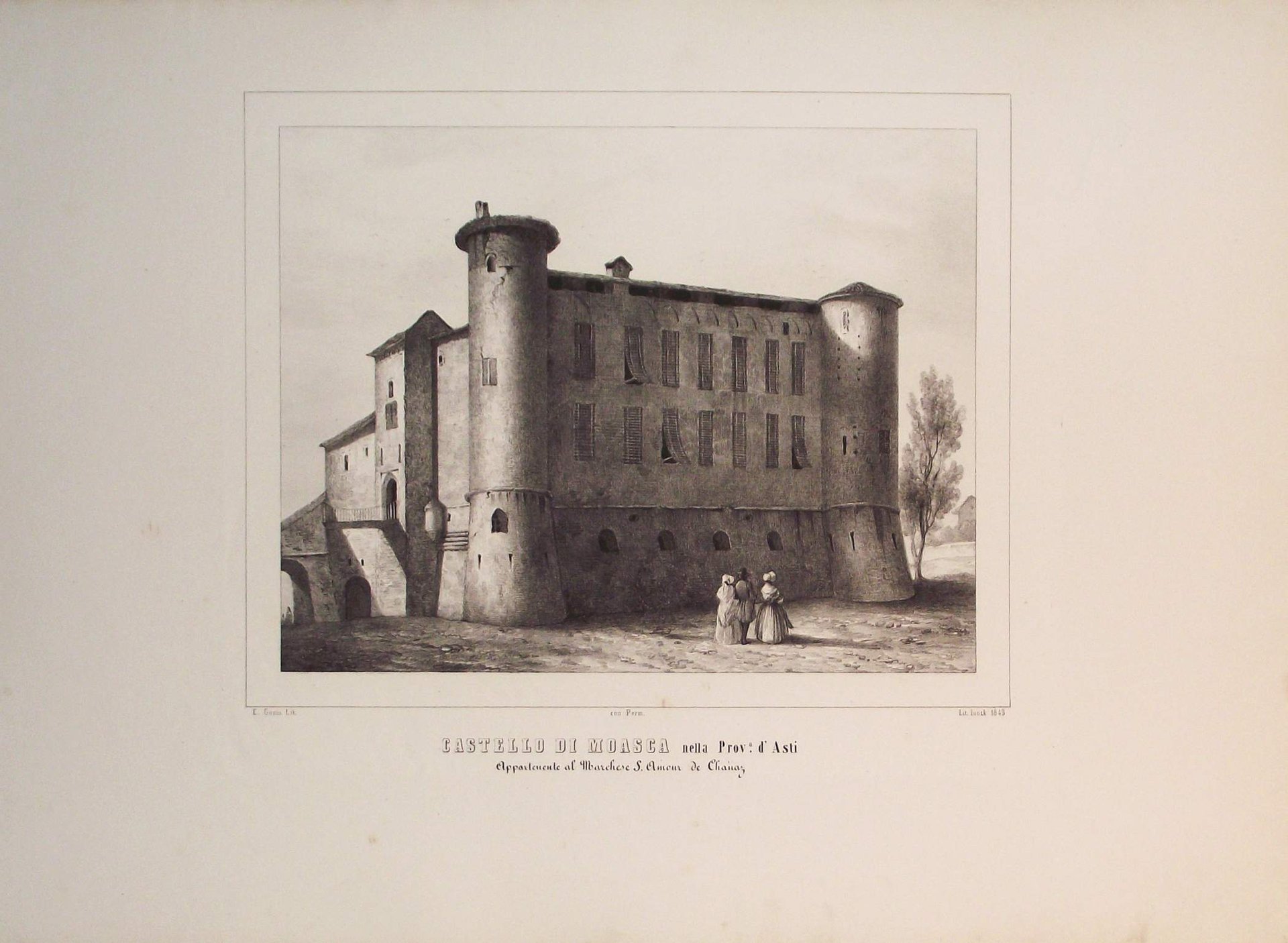>Litografia originale circa 450x620 mm, firmata da Enrico Gonin quale autore del disegno e da J. Junck, Fr.lli Doyen o D.Festa quali litografi. Bella veduta animata da personaggi in primo piano, è l'unica incisione di Moasc realizzata prima della metà dell'800. Impressi nel margine inferiore sono il titolo e l'indicazione della famiglia nobile proprietaria. Bell'esemplare a pieni margini tratto dall'Album delle principali Castella Feudali della Monarchia di Savoia. Torino, Fontana, 1841-57, contenente 200 tavole litografiche disegnate e litografate da Enrico Gonin impresse a Torino da D. Festa, Junck e Doyen, celebre serie di vedute dei castelli e ville del Piemonte e Valle d'Aosta Enrico Gonin (Torino, 1798-1856), fratello del più noto pittore Francesco; discepolo di Pietro Giovanni Palmieri, ereditò da questi l'arte litografica, e lavorò profusamente per gli editori Marietti, Doyen e Fontana. Queste vedute, espressione di un tardo romanticismo pittorico, oltre ai loro pregi artistici e alla loro importanza per la storia dell'arte litografica in Piemonte, costituiscono un documento di eccezionale valore per lo studio del patrimonio monumentale del Piemonte.Buon esemplare a pieni margini.