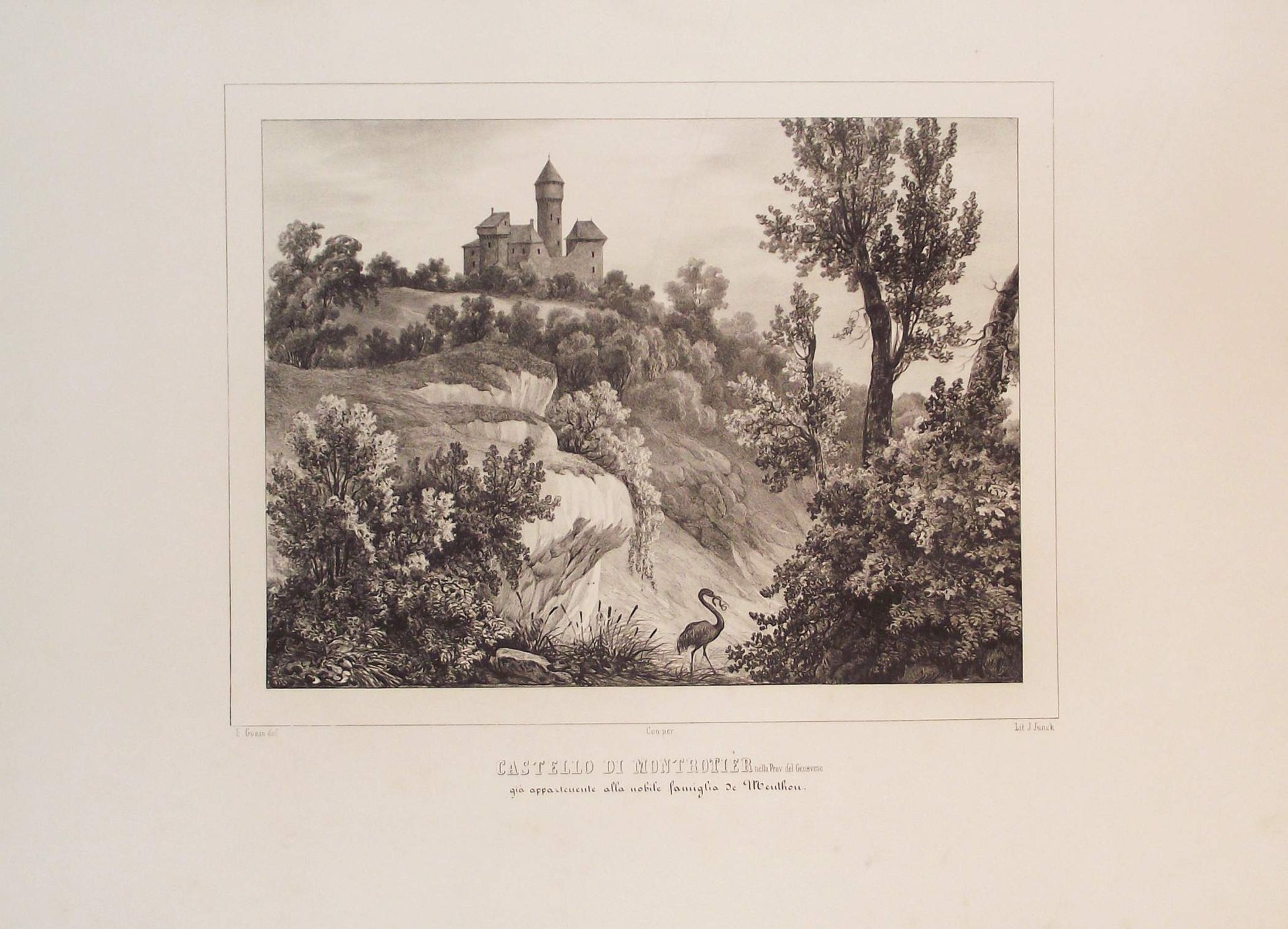 >Litografia originale circa 420x550 mm, firmata da Enrico Gonin quale autore del disegno e da J. Junck, Fr.lli Doyen o D.Festa quali litografi. Bella veduta animata da personaggi in primo piano, è l'unica incisione di Montrortier realizzata prima della metà dell'800. Impressi nel margine inferiore sono il titolo e l'indicazione della famiglia nobile proprietaria. Bell'esemplare a pieni margini tratto dall'Album delle principali Castella Feudali della Monarchia di Savoia. Torino, Fontana, 1841-57, contenente 200 tavole litografiche disegnate e litografate da Enrico Gonin impresse a Torino da D. Festa, Junck e Doyen, celebre serie di vedute dei castelli e ville del Piemonte e Valle d'Aosta Enrico Gonin (Torino, 1798-1856), fratello del più noto pittore Francesco; discepolo di Pietro Giovanni Palmieri, ereditò da questi l'arte litografica, e lavorò profusamente per gli editori Marietti, Doyen e Fontana. Queste vedute, espressione di un tardo romanticismo pittorico, oltre ai loro pregi artistici e alla loro importanza per la storia dell'arte litografica in Piemonte, costituiscono un documento di eccezionale valore per lo studio del patrimonio monumentale del Piemonte.Buon esemplare a pieni margini.