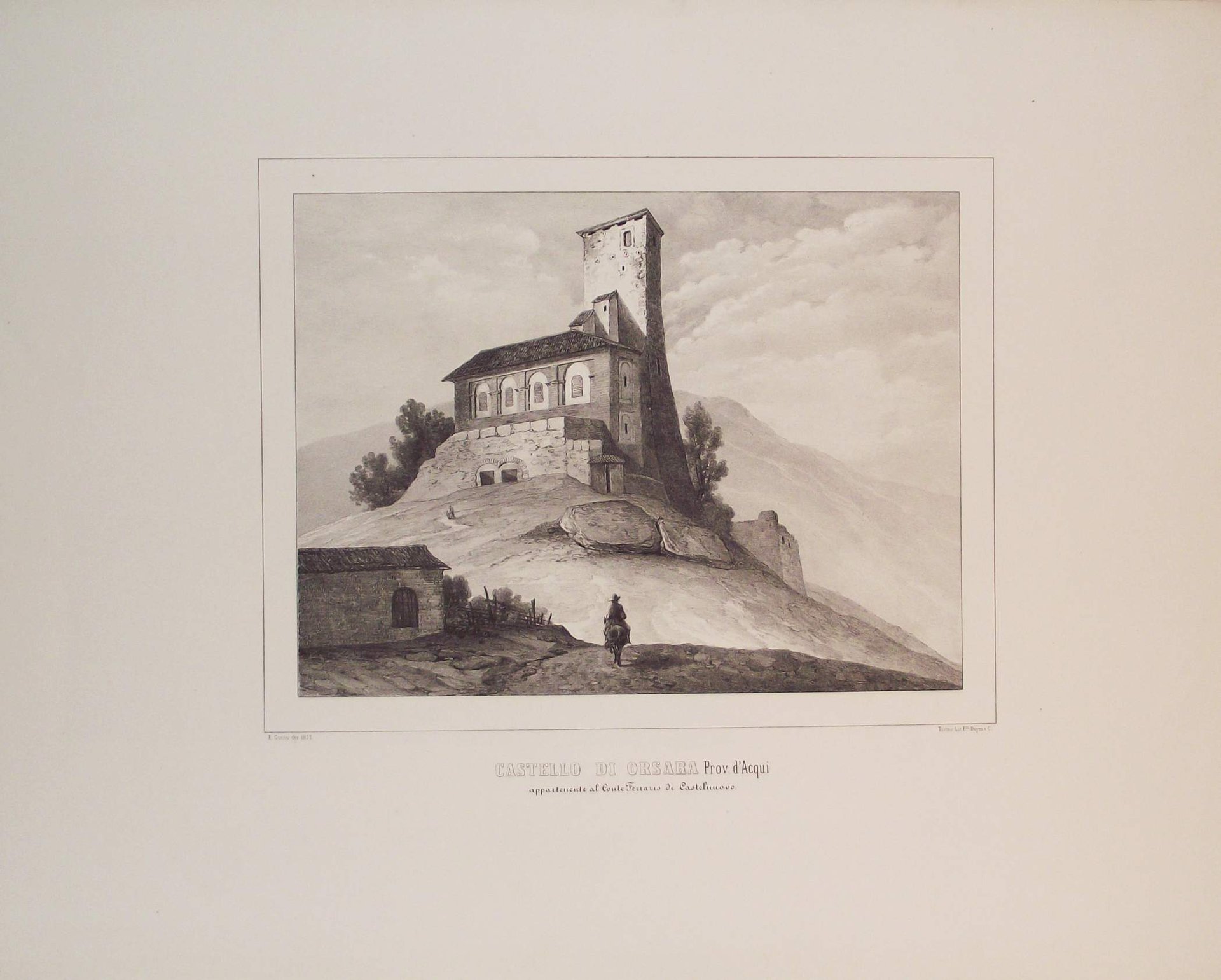 >Litografia originale circa 460x640 mm, firmata da Enrico Gonin quale autore del disegno e da J. Junck, Fr.lli Doyen o D.Festa quali litografi. Bella veduta animata da personaggi in primo piano, è l'unica incisione di Orsara realizzata prima della metà dell'800. Impressi nel margine inferiore sono il titolo e l'indicazione della famiglia nobile proprietaria. Bell'esemplare a pieni margini tratto dall'Album delle principali Castella Feudali della Monarchia di Savoia. Torino, Fontana, 1841-57, contenente 200 tavole litografiche disegnate e litografate da Enrico Gonin impresse a Torino da D. Festa, Junck e Doyen, celebre serie di vedute dei castelli e ville del Piemonte e Valle d'Aosta Enrico Gonin (Torino, 1798-1856), fratello del più noto pittore Francesco; discepolo di Pietro Giovanni Palmieri, ereditò da questi l'arte litografica, e lavorò profusamente per gli editori Marietti, Doyen e Fontana. Queste vedute, espressione di un tardo romanticismo pittorico, oltre ai loro pregi artistici e alla loro importanza per la storia dell'arte litografica in Piemonte, costituiscono un documento di eccezionale valore per lo studio del patrimonio monumentale del Piemonte.Buon esemplare a pieni margini.