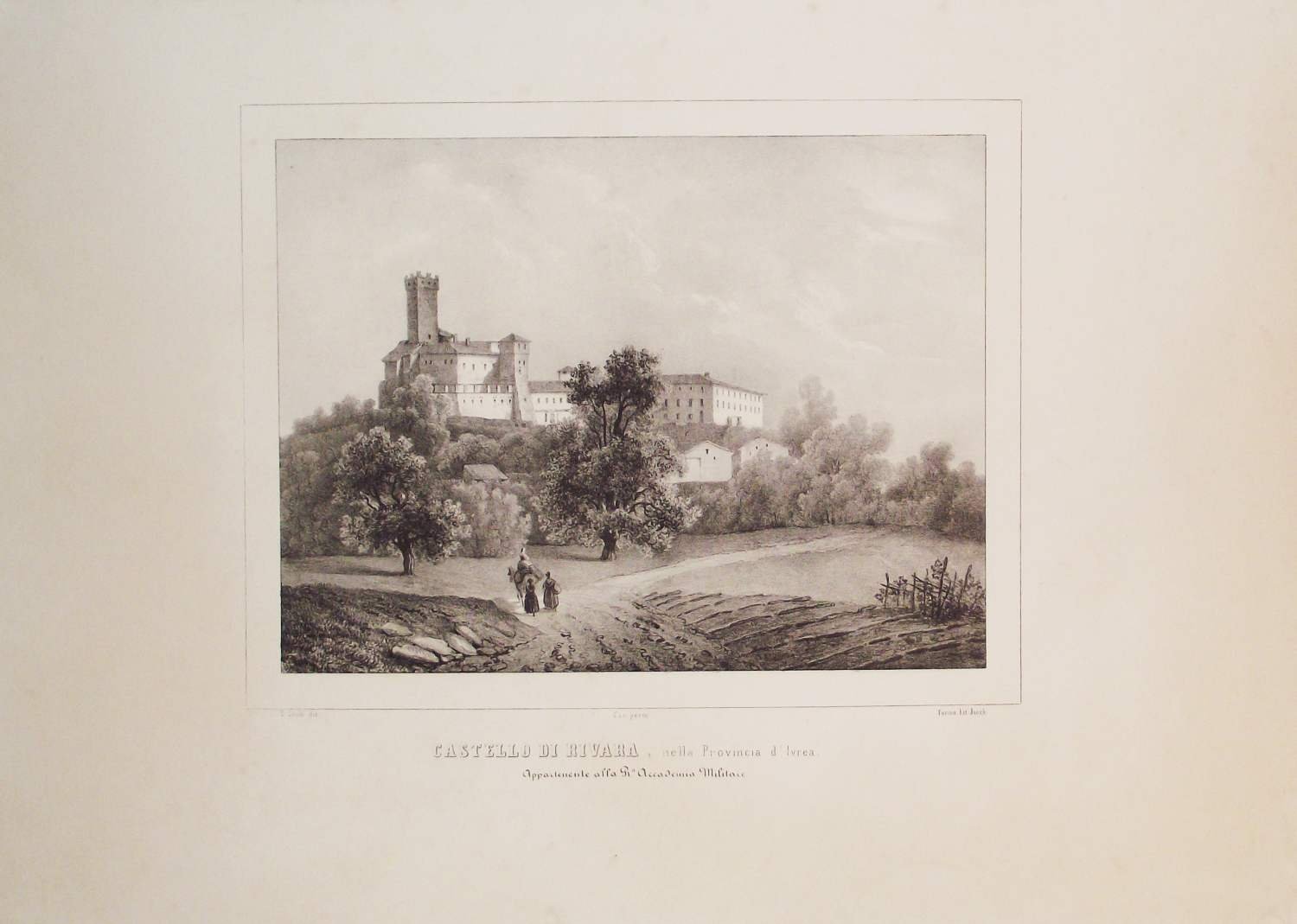 >Litografia originale circa 410x570 mm, firmata da Enrico Gonin quale autore del disegno e da J. Junck, Fr.lli Doyen o D.Festa quali litografi. Bella veduta animata da personaggi in primo piano, è l'unica incisione di Rivara realizzata prima della metà dell'800. Impressi nel margine inferiore sono il titolo e l'indicazione della famiglia nobile proprietaria. Bell'esemplare a pieni margini tratto dall'Album delle principali Castella Feudali della Monarchia di Savoia. Torino, Fontana, 1841-57, contenente 200 tavole litografiche disegnate e litografate da Enrico Gonin impresse a Torino da D. Festa, Junck e Doyen, celebre serie di vedute dei castelli e ville del Piemonte e Valle d'Aosta Enrico Gonin (Torino, 1798-1856), fratello del più noto pittore Francesco; discepolo di Pietro Giovanni Palmieri, ereditò da questi l'arte litografica, e lavorò profusamente per gli editori Marietti, Doyen e Fontana. Queste vedute, espressione di un tardo romanticismo pittorico, oltre ai loro pregi artistici e alla loro importanza per la storia dell'arte litografica in Piemonte, costituiscono un documento di eccezionale valore per lo studio del patrimonio monumentale del Piemonte. Buon esemplare a pieni margini.