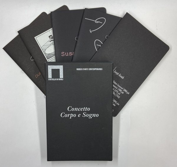 Cofanetto rigido in tela nera con 5 libretti cm13x21 con peculiare legatura con anelli metallici, ciascuno dedicato a lavori esposti al Castello di Rivoli nell’ambito della serie «Concetto, Corpo e Sogno» nel 2006. Il cofanetto comprende: 1. JOAN JONAS, DUE OPERE/TWO WORKS; 2. DAN GRAHAM; 3. LAWRENCE WEINER, MADE TO PRODUCE A SPARK/FATTA PER PRODURRE UNA SCINTILLA; 4. SUSAN HILLER; 5. JOSEPH KOSSUTH, LAVORI: ‘VEDERE CONOSCERE’ (2004) PiÙ ‘SERIE WITTGENSTEIN’ (1989) PIÙ ‘VEDERE LEGGERE’ (1979) PIÙ ‘UNA E TRE SEDIE’ [ITA] (1965).
