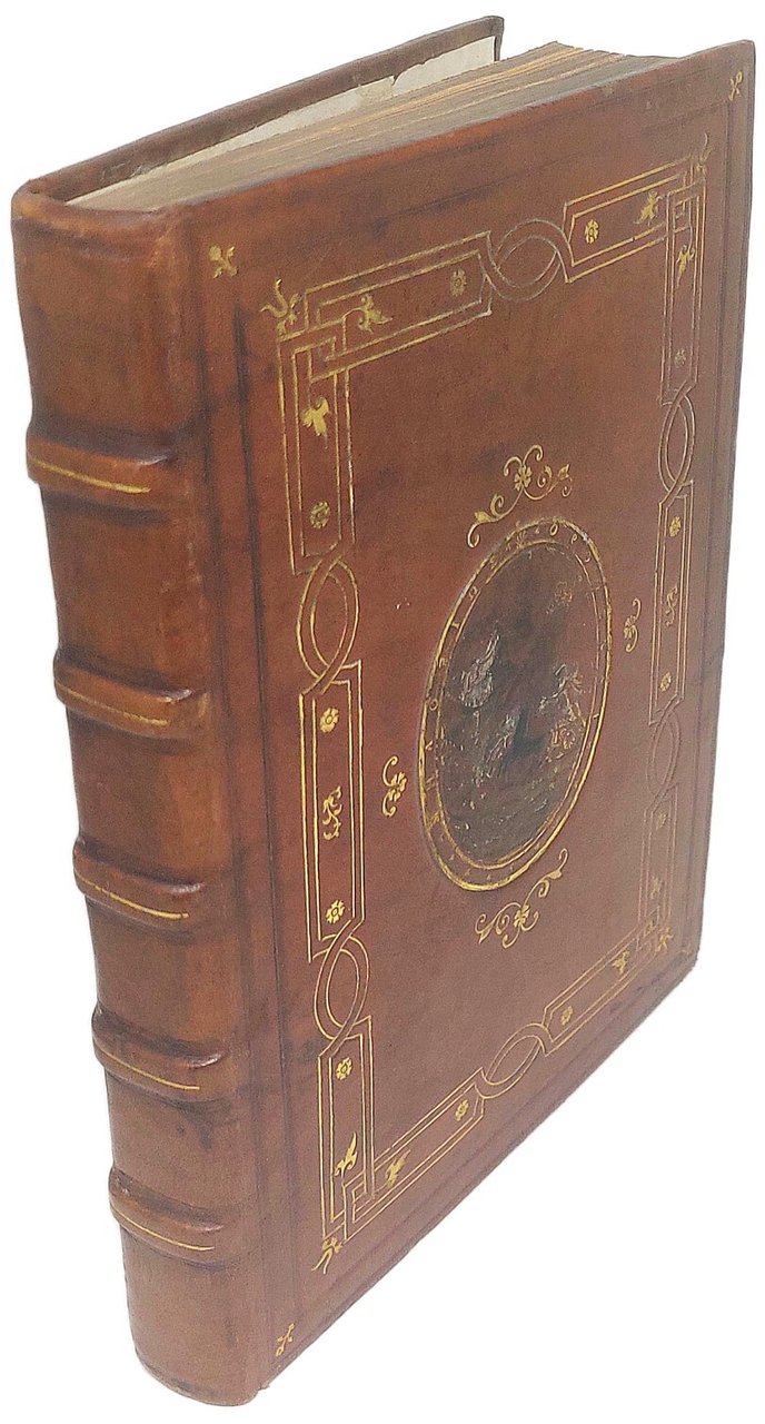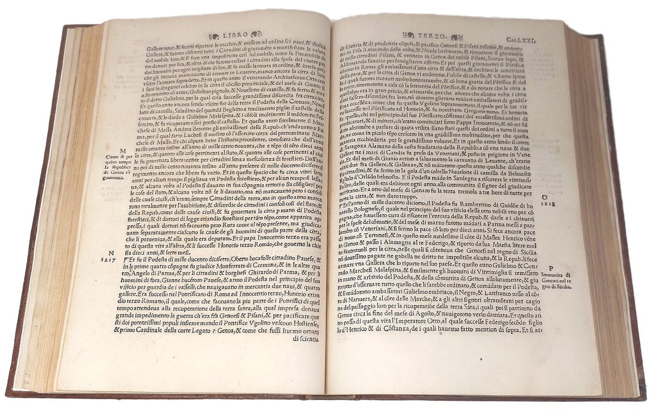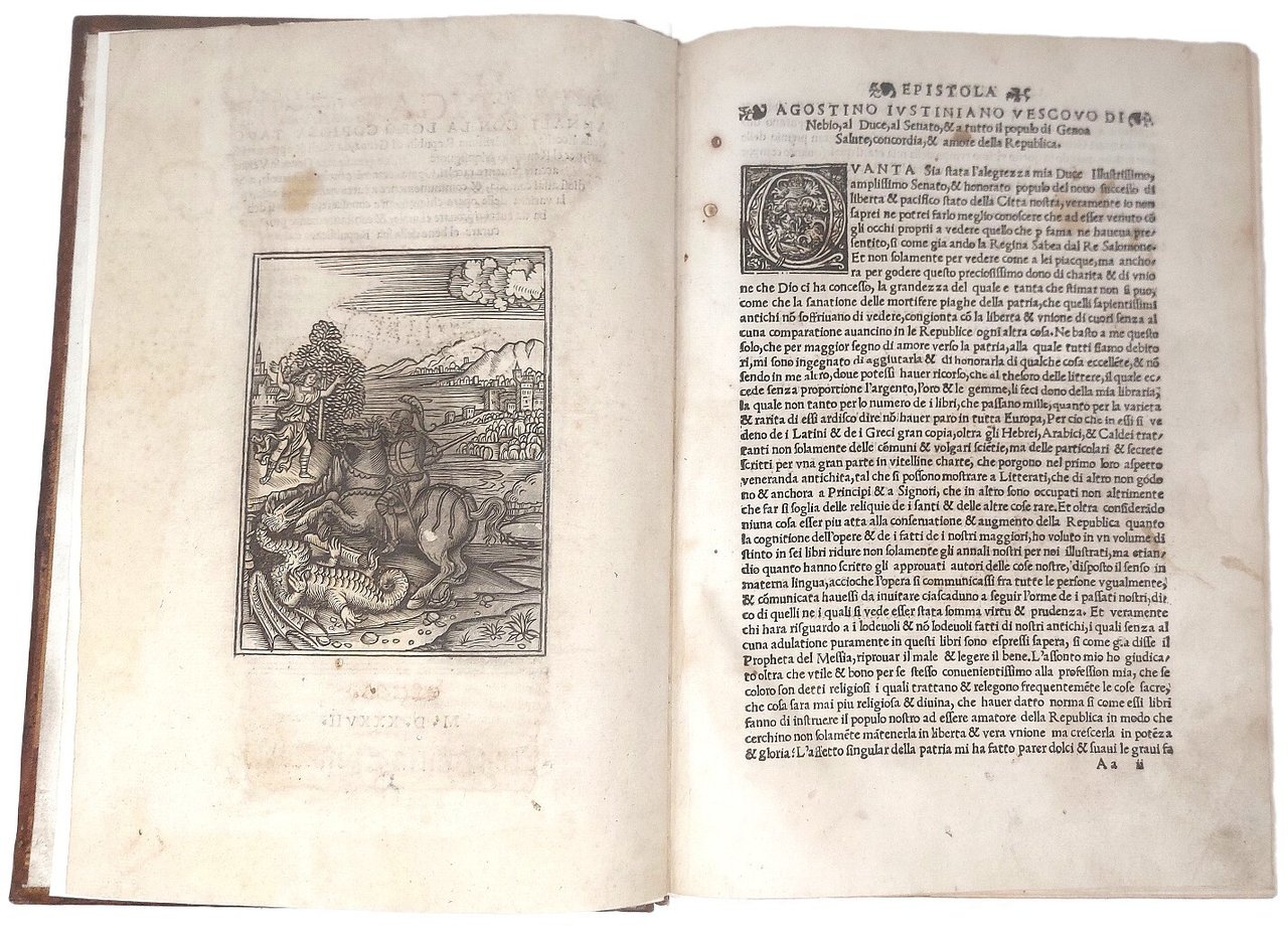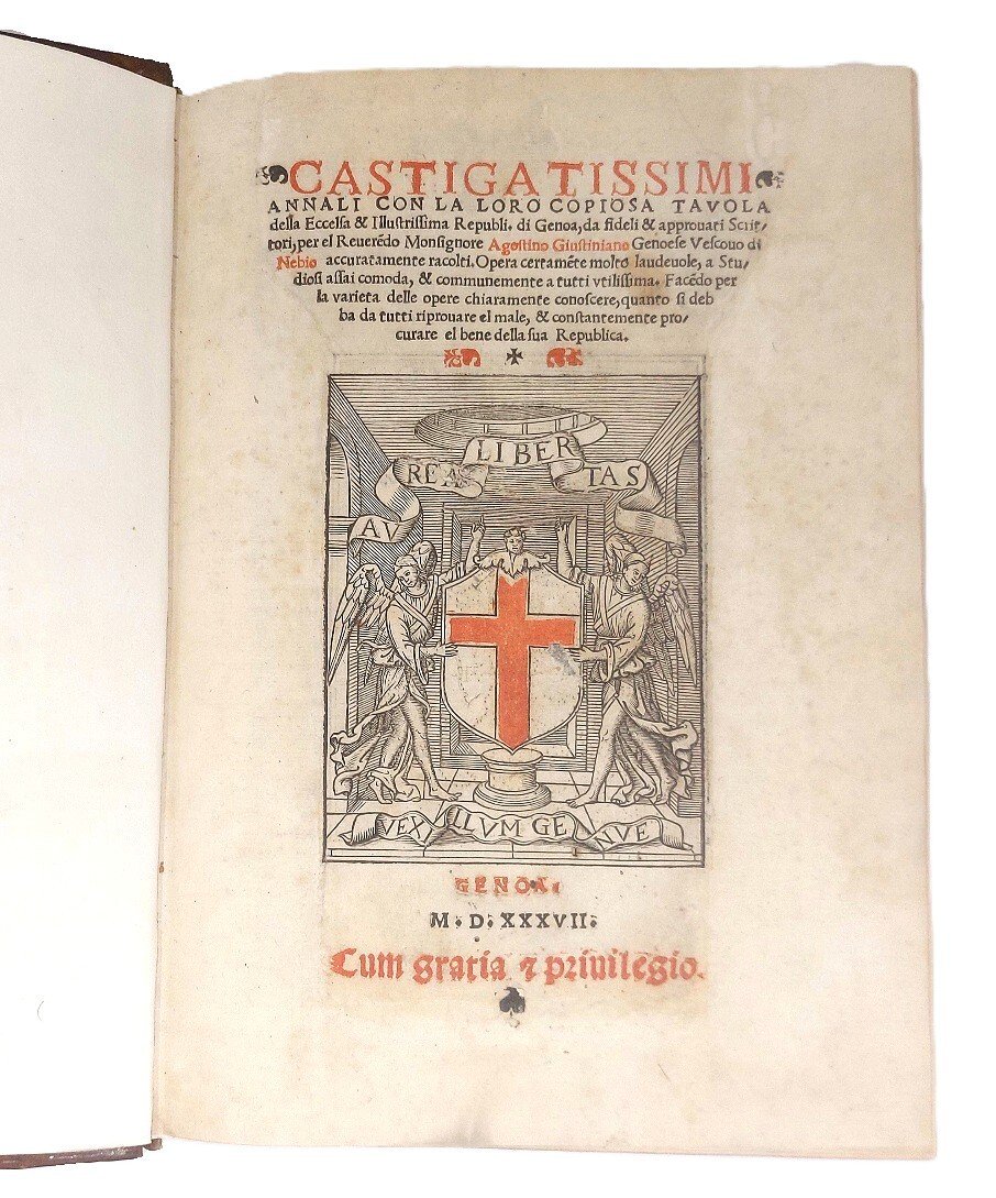 >in-folio (280x200 mm), ff. (12), CCLXXXII, carattere tondo, titolo in rosso e nero con xilografia raffigurante uno scudo con le armi di Genova ''aurea libertas vexillum Genue'' sostenato da due angeli alati. Al verso del foglio altra silogr. di San Giorgio e il drago (125x97 mm). Grandi e piccoli capilettera ornati. Elegante legatura moderna in pieno marocchino marrone ad imitazione delle legature cinquecentesche ''Apollo e Pegaso'' di Canevari ed invecchiata ad arte, decorata in oro con figura emblematica impressa in ovale al centro dei due piatti. Prima edizione di quest'opera rara, fondamentale sulla storia di Genova e della regione dall'origine al 1527. Nel I libro, dopo una breve descrizione della Liguria, si forniscono notizie specifiche su Nizza, Ventimiglia, le valli di Marro e Diano, Pieve di Teco, Albenga, Finale, Noli, Savona e Val Polcevera. Interessante sotto l'anno 1493 (f. 249 r.) il passaggio che parla di ''Christoforo Colombo Genovese inventore della navigatione al mondo novo''. Volume accuratamente impresso, come si legge nel colophon, ''con diligencia, & opera del nobile Laurentio Lomellino Sorba'' e stampata da ''Antonio Bellono Taurinense''. Buon esemplare, con foglio di titolo accuratamente rimarginato, lievissima uniforme arrossatura nella parte finale. (Ex-libris Michel Wittock). Sander II, 3191. STC 306. Manno VI, 22440. Harrisse n. 220. Leclerc, Bibl. Americana, Cat. (1687), n. 642. Lozzi 2120: «Opera rara e ricercata anche dai collettori delle cose americane...». Adams G751. Harrisse 220. Sabin 27518. European Americana 537/11.