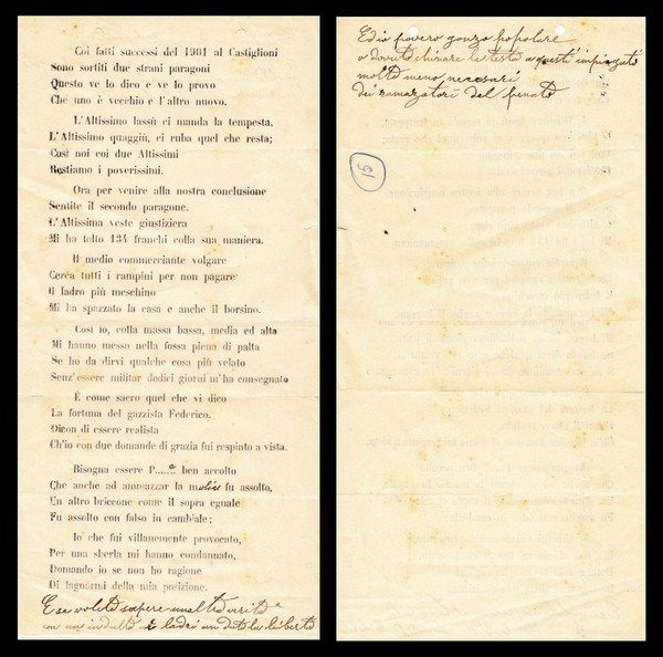poesia racconto della condanna del 1901 a Castiglioni di 1 facciata con delle frasi manoscritte a piè pagina; buon es.