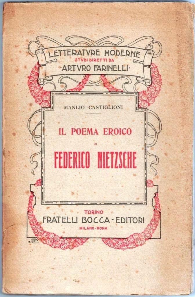 Manlio Castiglioni, Il poema eroico di Federico Nietzsche, Fratelli Bocca Editori, Torino 1924, pp. 382, cm 20, br. ed. Collana Letterature moderne. Studi diretti da Arturo Farinelli, vol. VIII. Firma d’appartenenza e data all’occhiello. Leggere tracce d’uso alla brossura, una piccolissima mancanza al dorso, per il resto minime fioriture, lieve brunitura della carta, ma volume nel complesso in ottimo stato. Intonso.