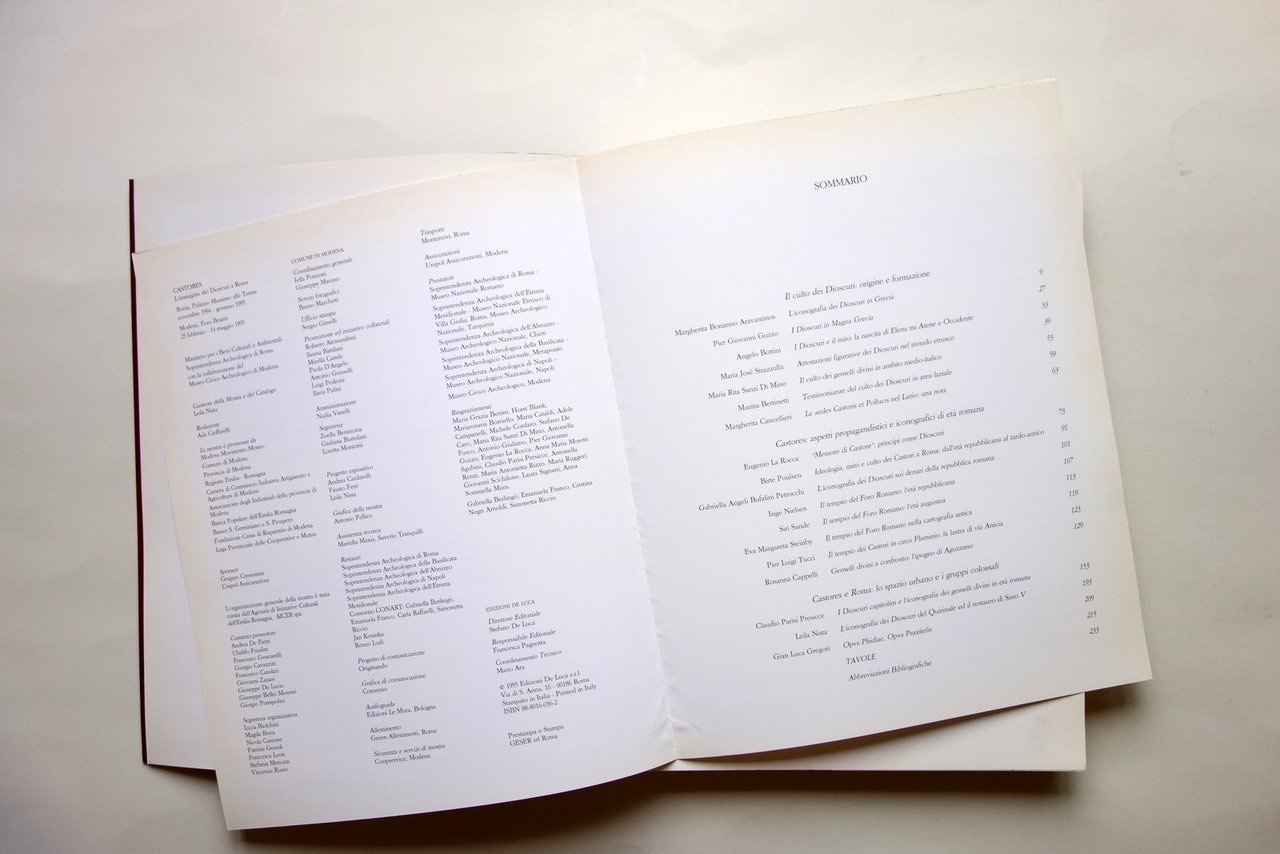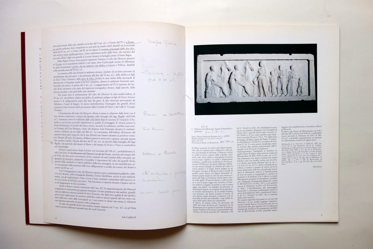 Lelia Nista (a cura di), Castores l'immagine dei Dioscuri a Roma a cura di Lelia Nista Edizioni De Luca, Roma 1995; cm 30x24; pp. 240 con numerosissime ill. in b/n nel t. e fuori t.; brossura ed. ill. con bandelle. Accluso il fascicolo - guida alla mostra di cm 29,5x24, pp. 32 con ill. in b/n e a colori, brossura ed. con bandelle. Condizioni di conservazione Entrambi in buone condizioni con tracce d'uso; catalogo con un paio di piccoli difetti al margine inf. della brossura post., taglio sup. con lievi tracce di sporco; bifolio contenente frontespizio e indice quasi totalmente staccato dal corpo del testo, esemplare peraltro ben saldo e compatto, con interni ottimi. Fascicolo - guida alla mostra sottolineature e qualche annotazione a matita ad alcune pagine, peraltro ben conservato. Per maggiori informazioni sul contenuto vedi foto indice. SETT125.L23855 N