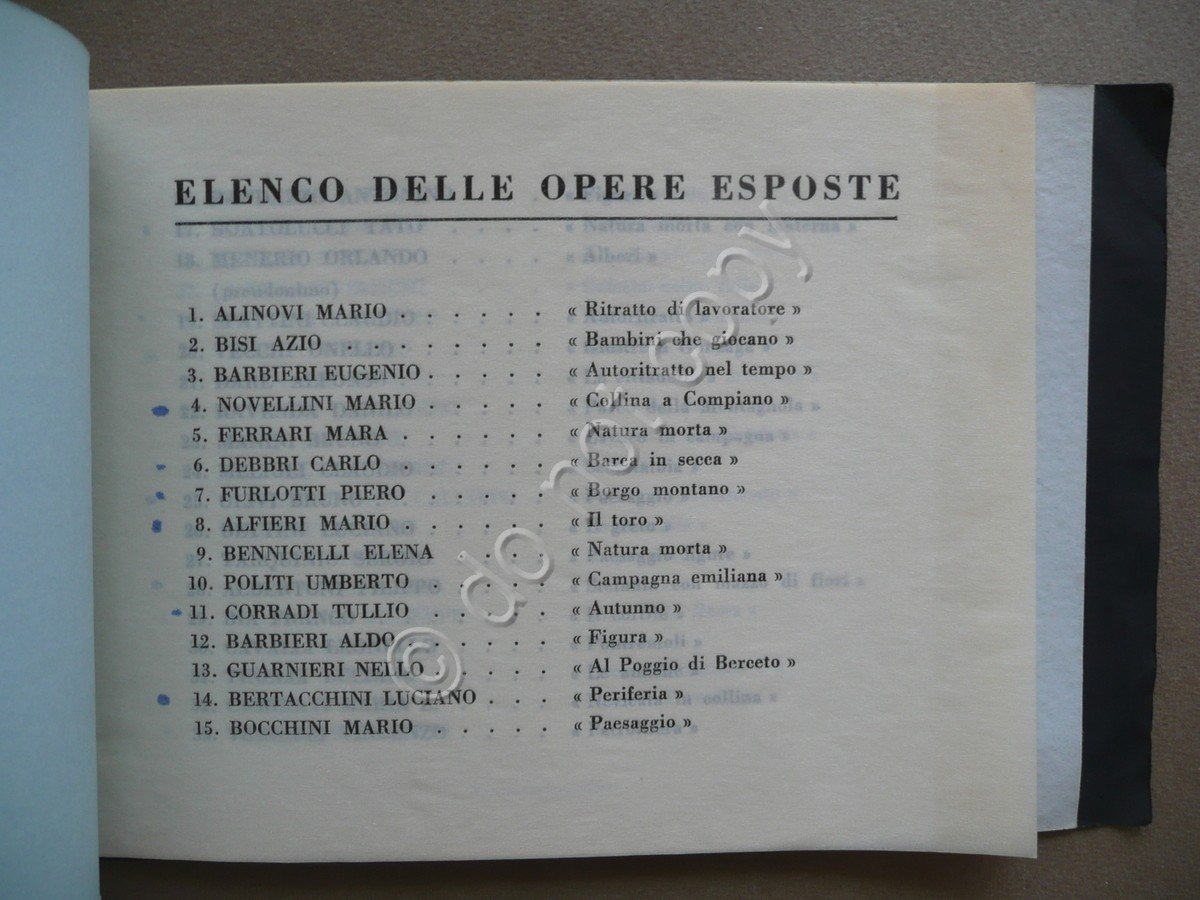 Catalogo, Settima Mostra di Pittura Premio Città di Fidenza" Salone Piazza Verdi, 3 4 - 11 ottobre 1959 Tip. La Commerciale, Fidenza 1959, cm 13,5x21,5, pp. non num., breve catalogo costituito dall'elenco dei membri del comitato promotore, della giuria e delle opere esposte (pp.5), brossura ed. sagomata. Timbretto di vecchia raccolta privata al retro dell'ultima pagina. Condizioni di conservazione Esemplare in buone condizioni con tracce d'uso, un margine della br. post. con leggere tracce di pieghette ai margini e agli angoli, alcuni nomi dell'elenco delle opere evidenziati con piccolo pallino blu posto a margine. SC03.D9301 N "