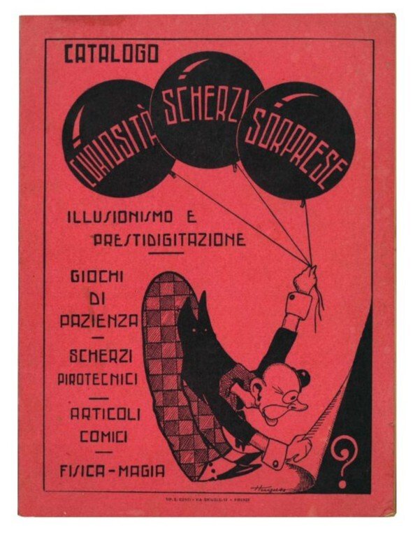 Mm. 224x165. Pp. 50, [2]. Con illustrazioni in b/n n.t. ad opera dell'artista anglo-fiorentino Hugues. Catalogo figurato di scherzi, articoli comici, prestigiazione, giochi di pazienda... C. lievemente ed uniformemente brunita. Brossura editoriale illustrata (presente etichetta editoriale alla cop. posteriore).