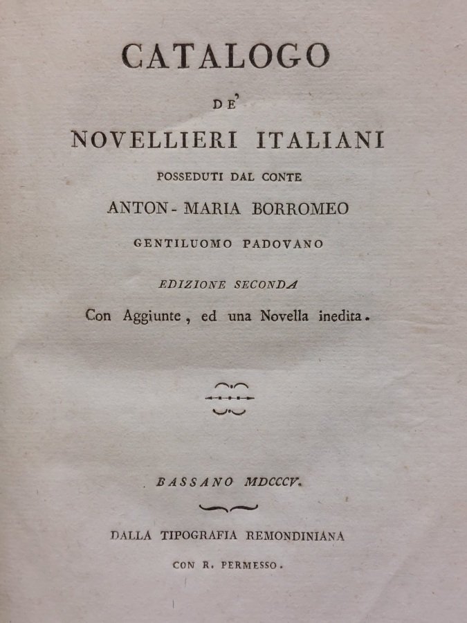 Catalogo de' novellieri italiani posseduti dal conte Anton-Maria Borromeo gentiluomo padovano. Edizione seconda con aggiunte, ed una novella inedita.