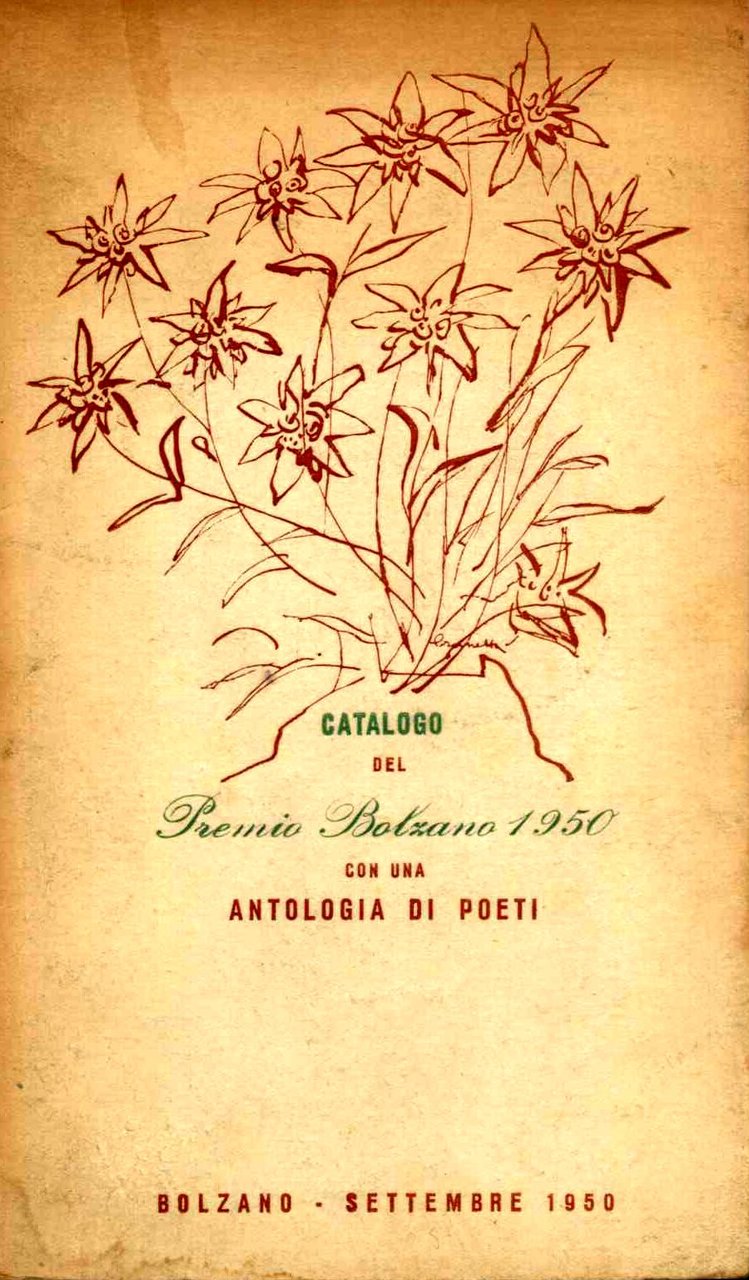 Catalogo del Premio Bolzano 1950 con una antologia di Poeti.Cromotipo Milano, Settembre 1950., Milano, 1950. In 8�, br. edit. ill., pp. 88, con ill. fotografiche b.n. n.t. e piccoli ritratti usati come testatine delle poesie di Sassu, Remo Brindisi, Felice Casorati e numerose altri in rosso n.t.; edito in occasione del Premio Bolzano 1950 delle pittrici italiane; poesie di De Pisis (Mazzo di fiori), De Micheli, Beniamino Dal Fabbro (La portinaia), Cardarelli (Tempo che muta), Eugenio Montale (Serenata indiana), Palazzeschi (Crisantemo), Giovanni Papini (Regina Silvestre), Salvatore Quasimodo (Presso l'Adda), Umberto Saba (Angelo), Giuseppe Ungaretti (Gridasti Soffoco), Ardengo Soffici (Elegia dell'ambra), e molti altri; oagine lievemente bruibite , legg. tracce di umidit�buon esemplare