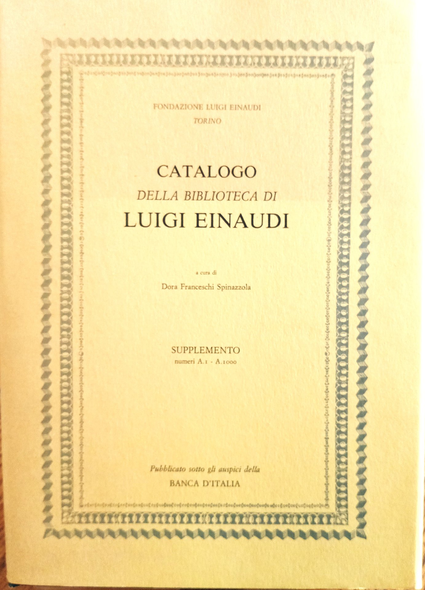 I ed. Supplemento (numeri A.1 - A.1000) del Catalogo, che presenta un aggiornamento circa le nuove acquisizioni di testi rari da parte della Fondazione. Volume pubblicato sotto gli auspici della Banca d'Italia. Indice: Fondazione Luigi Einaudi, Presentazione - Dara Franceschi Spinazzola, Introduzione - Abbreviazioni - Sezione I. Manoscritti - Sezione II. Opere a stampa - Sezione III. Periodici - Indice cronologico - Indice dei nomi - Indice delle tavole. In-4, pp. 2nn+XVI+226, cart., sovracc. Con 11 tavole in nero f. t. Stato buono-ottimo
