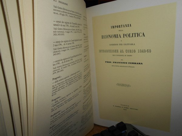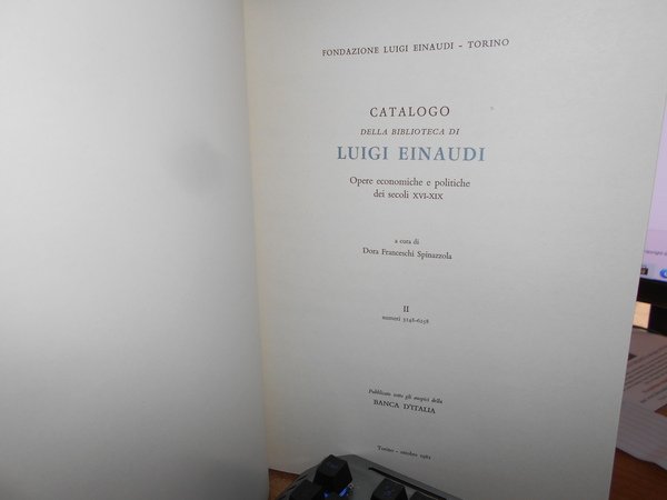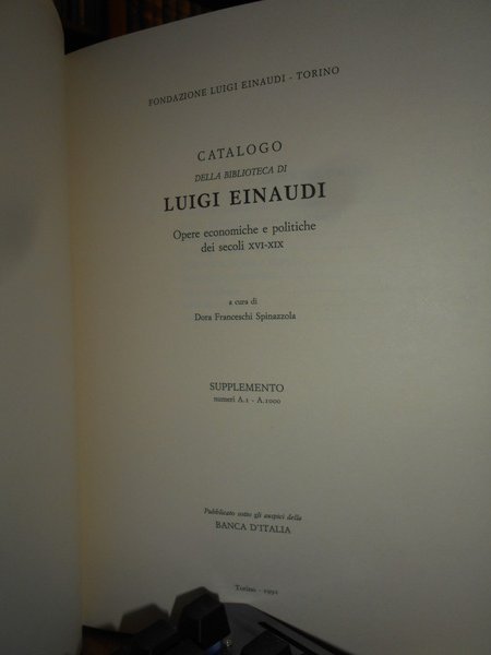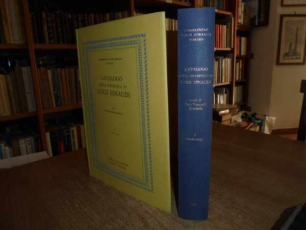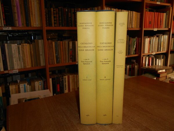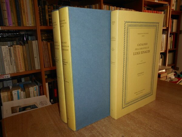A cura di DORA FRANCESCHI SPINAZZOLA. Torino, Pubblicato sotto gli auspici della BANCA D' ITALIA, 1981 - 1991. CATALOGO della Biblioteca di LUIGI EINAUDI. Opere economiche e politiche dei secoli XVI-XIX. 3 volumi in-4°, tela bleu con titoli in oro ai dorsi, sovracopertine. I. numeri 1-3147. xxxi, 473 pp. con ritratto a colori e tavole fuori testo.; II. numeri 3148-6258. da p. 474 a p. 954. con tavole fuori testo; III. supplemento. numeri A.1 - A.1000. xv, 224, (1) pp. con tavole f.t. Opera completa perfettamente conservata con cofanetto per i due volumi. Uff. E - IV - 6