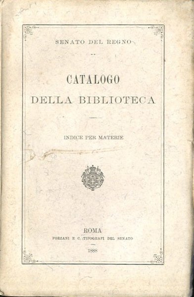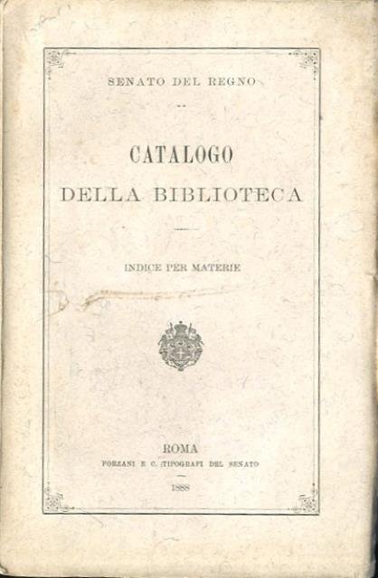 XIX, 710 p. ; 23 x 15 cm. "Il presente indice per materie abbraccia le opere comprese nel catalogo alfabetico per nomi di autore pubblicato nel 1879 e nell'appendice al medesimo, uscita nel 1886. Non comprende invece le Miscellanee che si trovano in un'altra appendice, del 1884, già ordinata per materie" (dalle Avvertenze). Le categorie generali nelle quali si divide l'indice per materie sono: 1. Teologia; 2. Filosofia; 3. Scienze politiche e sociali; 4. Giurisprudenza e Legislazione; 5. Scienze amministrative e finanziarie; 6. Economia politica e Statistica, 7. Agricoltura, Industria e Commercio; 8. Scienze naturali; 9. Scienze mediche; 10. Scienze matematiche e fisiche; 11. Scienze militari; 12. Archeologia, Numismatica, Paleografia; 13. Storia e Geografia; 14. Biografia; 15. Belle Arti; 16. Letteratura e Filologia; 17. Educazione e Istruzione; 18. Enciclopedia, Bibliografia, ecc.; 19. Elenco dei periodici e delle riviste politiche, scientifiche e letterarie. . Brossura editoriale, coperta in cartoncino flessibile con titolo impresso in nero al piatto e al dorso. Segni del tempo alla coperta, presente un piccolo strappo al piatto, carta interna in buono stato. Libro intonso. Codice libreria 4864.