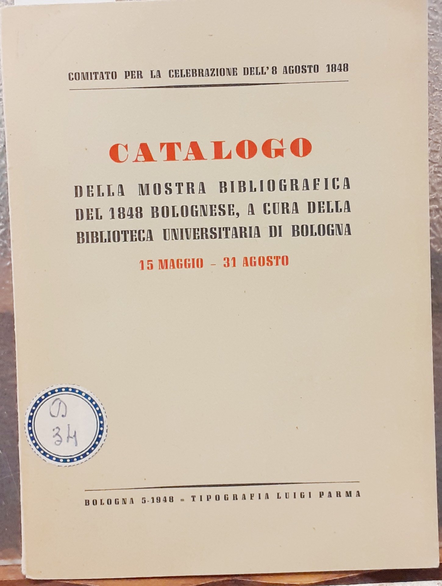 CATALOGO DELLA MOSTRA BIBLIOGRAFICA DEL 1848 BOLOGNESE. A cura della BIBLIOTECA UNIVERSITARIA DI BOLOGNA. 15 maggio-31 agosto.