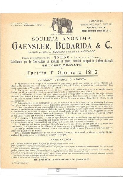 IN 8° gr.( cm.27 X 21,5 ), pp.15.CATALOGO DELLA SOCIETA' ANONIMA GAENSLER, BEDARIDA<BR> & C, SOCIETA' PER LA FABBRICAZIONE DI STOVIGLIE ED OGGETTI SMALTATI STAMPATI IN LAMIERA D'ACCIAIO. TARIFFA 1° GENNAIO 1912. CATALOGO COMPLETAMENTE ILLUSTRATO CON I PRODOTTI DI FABBRICA E SUE CARATTERISTICHE in b/n. STABILIMENTO PREMIATO CON MEDAGLIA D'ARGENTO ALL'ESPOSIZIONE INTERNAZIONALE DI TORINO, 1911.<BR>OTTIMA CONSERVAZIONE DI QUESTO RARO CATALOGO.