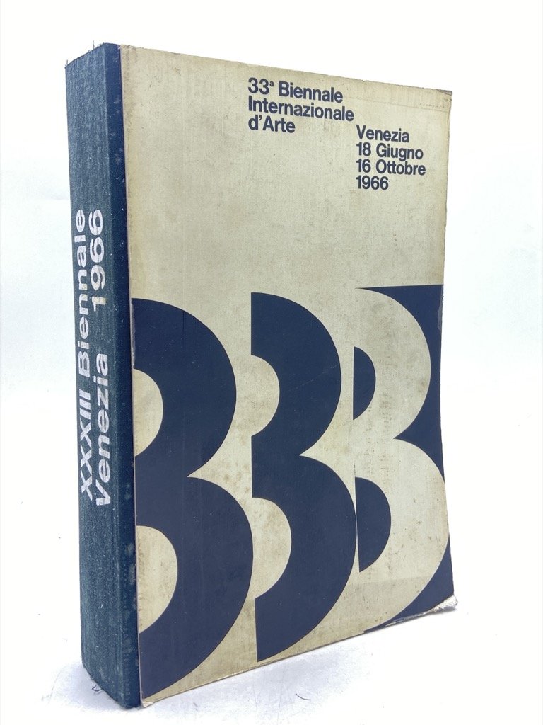 Legatura editoriale illustrata con dorso in tela e piatti cartonati, cm 29 x 15, pp LXXVI 254 (2) con 258 illustrazioni in nero (su 246 pagine in carta patinata), tavole in carta grigia con titoli e mappe, e (78) + (8) pagine pubblicitarie. Lievi segni d’uso sulla copertina, macchiette sul dorso. Seconda edizione, ampliata nel numero di pagine e illustrazioni, del catalogo della 33a Biennale veneziana; il volume, curato da Umbro Apollonio con la collaborazione di Biancamaria Borri e Antonio Gnan, è impaginato da Massimo Vignelli e in copertina riproduce il manifesto di Bob Noorda / Unimark per la manifestazione. Con sezioni dedicate alle retrospettive di Umberto Boccioni (Guido Ballo) e Giorgio Morandi (Roberto Longhi), agli Aspetti del primo Astrattismo Italiano (Nello Ponente, con opere di Carla Badiali, Oreste Bogliardi, Lucio Fontana, Aldo Galli, Virgilio Ghiringhelli, Osvaldo Lucini, Fausto Melotti, Bruno Munari, Mario Radice, Mario Reggiani, Mario Rho, Atanasio Soldati e Luigi Veronesi), alle Arti Decorative delle Venezie (Astone Gasparetto), ai Padiglioni dei diversi paesi e a quello italiano con testi su Alberto Burri (V. Rubiu), Franco Gentilini (M. Valsecchi), Giulio Turcato (N. Ponente), Lucio Fontana (G. Dorfles), Antonio Corpora, Piero Dorazio (U. Apollonio), Alberto Viani, Giafranco Fasca, Franco Garelli, Enrico Paulucci, Giuseppe Zigaina, Emilio Scanavino e molti altri.