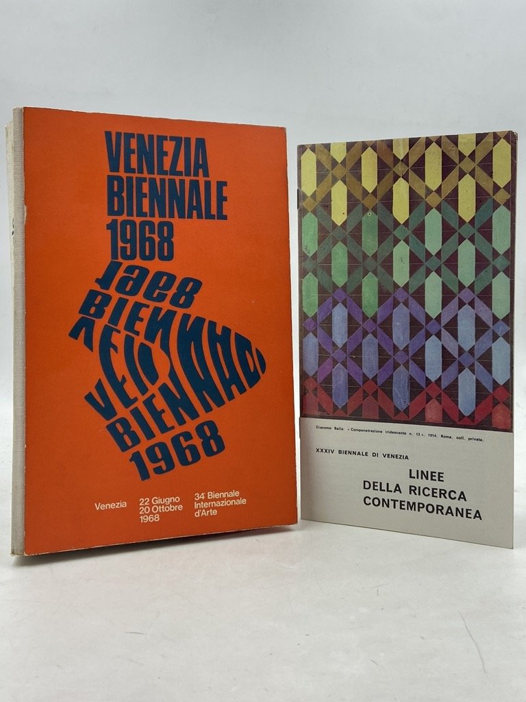 Legatura editoriale illustrata con dorso in tela e piatti cartonati, cm 29 x 15, pp (4) LXXXVIII 176 (2) con CXXXII + 211 illustrazioni in nero su carta patinata (quelle numerate 186-211 su mezza pagina), titoli e mappe su carte arancio, e (92) + (18) pagine pubblicitarie. Lievi segni d’uso sulla copertina, macchiette sul dorso. Piccolo difetto tipografico (piega) su una carta di occhietto della quarta sezione. Seconda edizione, ampliata nel numero di pagine e illustrazioni, del catalogo della 33a Biennale veneziana; il volume, curato da Umbro Apollonio con la collaborazione di Antonio Gnan e Ernesto Rubin de Cervin, è impaginato da Massimo Vignelli e sui piatti riproduce le due versioni del manifesto disegnato da Mario Cresci per la manifestazione. Con sezioni dedicate alle mostre Quattro maestri del Futurismo Italiano (di Maurizio Calvesi, con opere di Balla, Carrà, Russolo e Severini) e Linee della ricerca contemporanea: dall'informale alle nuove strutture, ai Padiglioni stranieri e a quello italiano con testi su Valerio Adami (Gillo Dorfles), Rodolfo Aricò (Guido Ballo), Arturo Bonfanti, Mario Deluigi, Gianfranco Ferroni (Luigi Carluccio), Luciano Gaspari, Lorenzo Guerrini, Giovanni Korompay, Gino Morandis, Pino Pascali (Palma Bucarelli), Achille Perilli (Alfredo Giuliani) e altri. Unito l'opuscolo spillato, cm 22 x 12, pp 24 inclusa copertina, col testo di Guido Ballo e alcune immagini a colori e in nero per la mostra Linee della ricerca contemporanea.