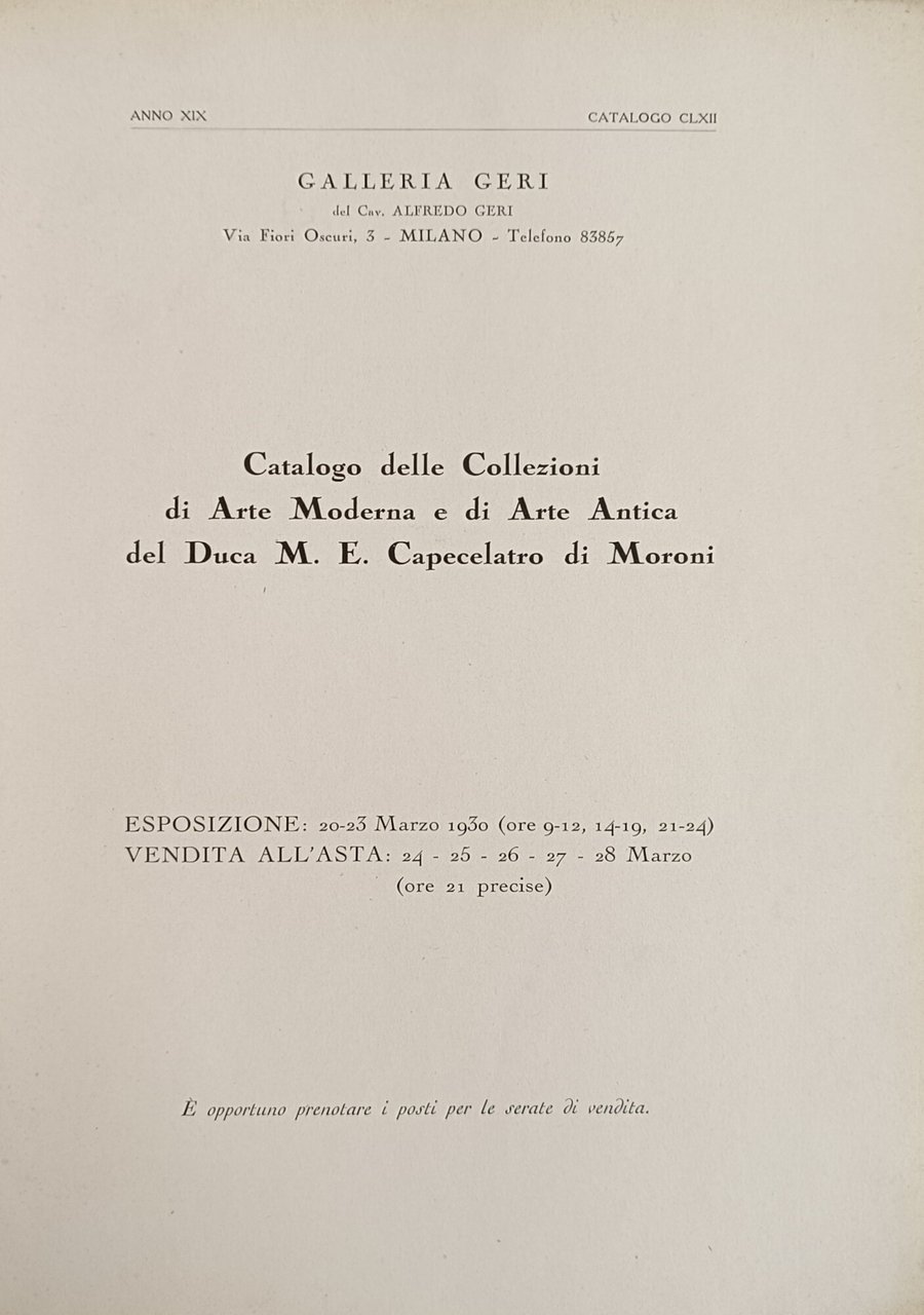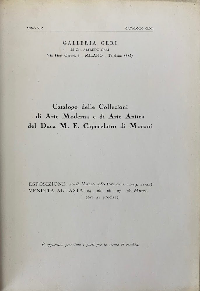 CATALOGO DELLE COLLEZIONI DI ARTE MODERNA E DI ARTE ANTICA DEL DUCA M. E. CAPECELATRO DI MORONI