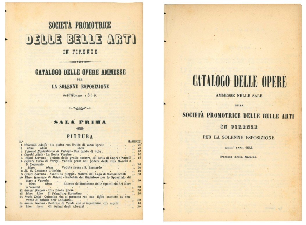 Mm. 188x119. Pp. 6; 7. Catalogo delle opere ammesse per la solenne esposizione dell'anno 1853 e 1854. Brossura editoriale.