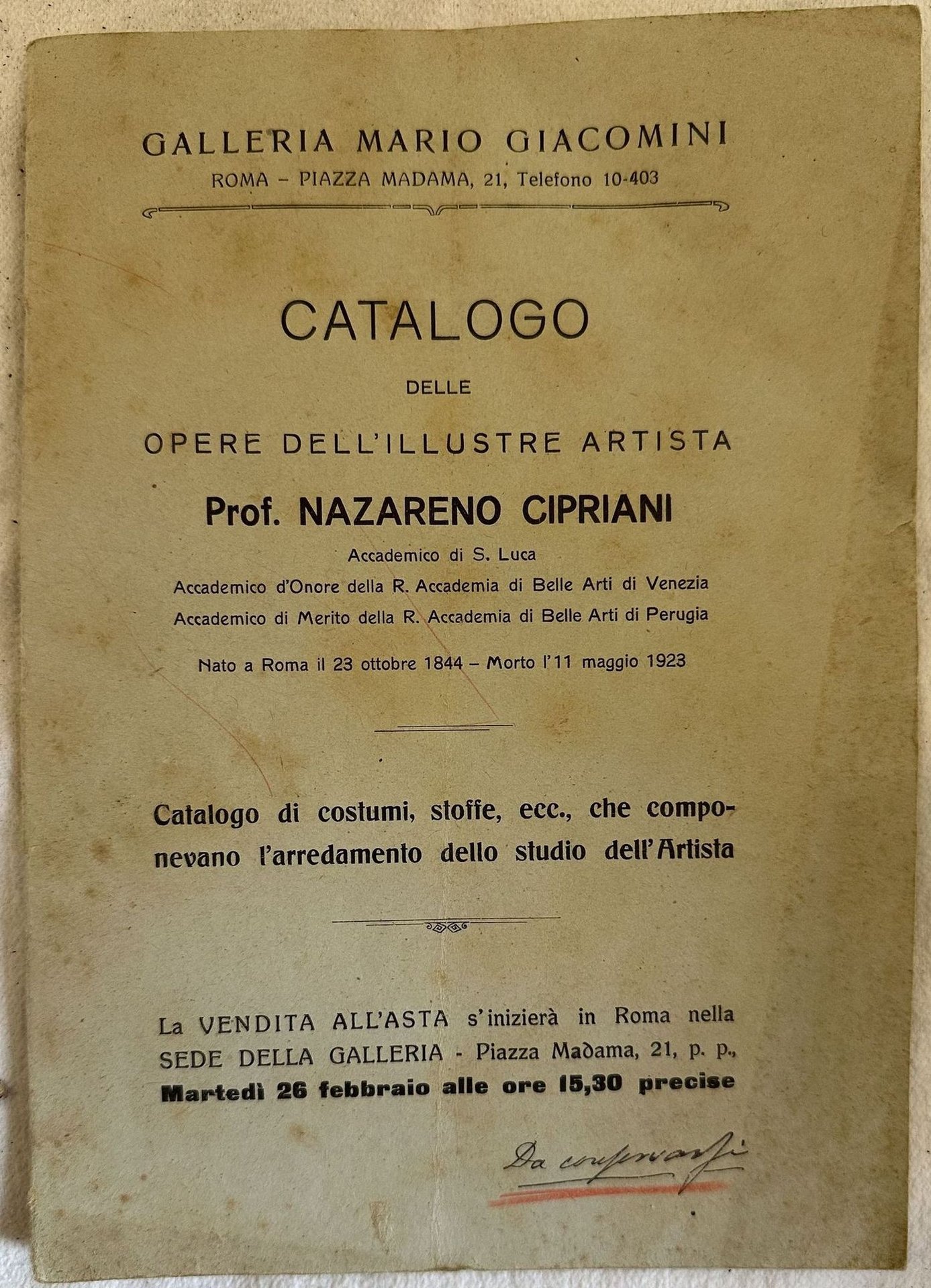 CATALOGO DELLE OPERE DELL'ILLUSTRE ARTISTA PROF. NAZARENO CIPRIANI ACCADEMICO DI S. LUCA NATO A ROMA IL 23 OTTOBRE 1844 - MORTO L'11 MAGGIO 1923CATALOGO DI COSTUMI, STOFFE, CHE COMPONEVANO L'ARREDAMENTO DELLO STUDIO DELL'ARTISTA